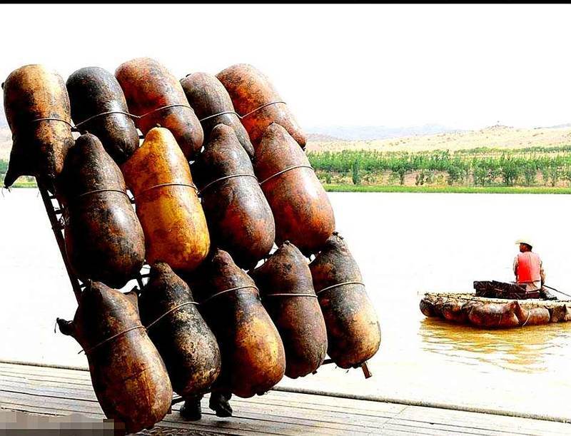 羊皮筏子,古称“革船”,别称“排子”。即将整张皮囫囵个儿褪下来,不能划破一点地方。脱毛后吹气使皮胎膨胀,灌入少量清油、食盐和水,然后把皮胎的头尾和四肢扎紧晾晒后,用麻绳将坚硬的水曲柳木条捆成方型的木框,扎在皮胎上面。千百年来,聪明勇敢的黄河儿女就这样用充气的牛羊皮胎里浮泅过河。