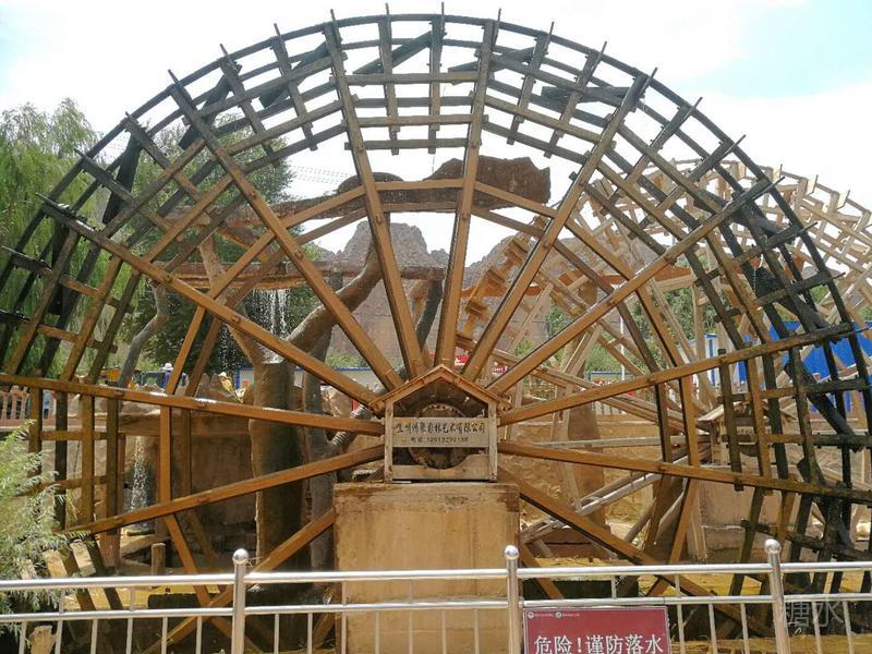 因为黄河的水位较低,一架大水车停在观景码头岸边,没有工作。