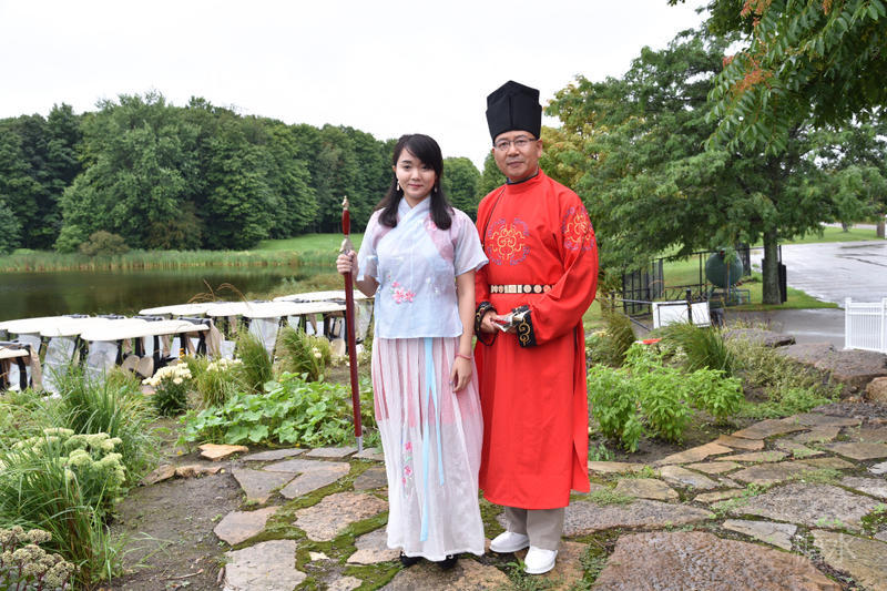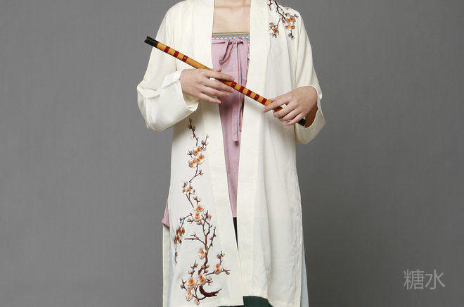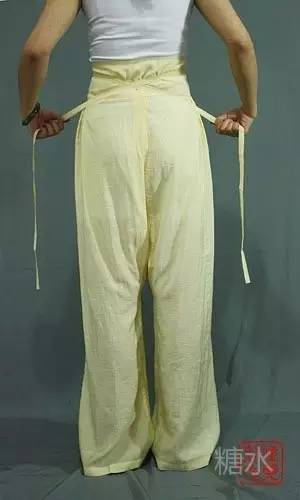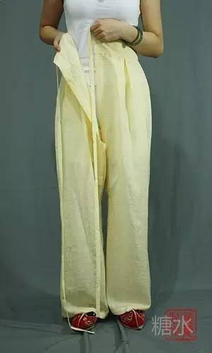 宋裤的设计,里面是不会走光的开裆裤,外面是两侧不缝合的开衩裤,走起路来和褙子相映成趣,低调又轻盈婉约。