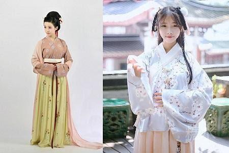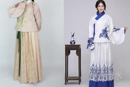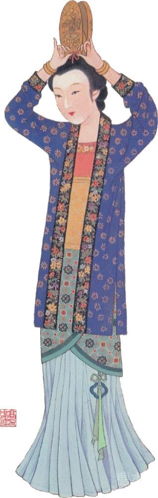 汉代女子服饰和男子一样,分为曲裾和直裾两种。曲裾则有大曲裾,小曲裾,短曲裾之分。大曲裾裙身为三绕式,短曲裾一般为两绕,小曲裾则多为一绕,从服装正面分开。往往礼服为大曲裾。而直裾相对较少。 魏晋时期妇女服装承袭秦汉的遗俗,在传统基础上有所改进,一般上身穿衫、袄、襦,下身穿裙子,款式多为上俭下丰,衣身部分紧身合体,袖口肥大,裙为多折裥裙,裙长曳地,下摆宽松,从而达到俊俏、潇洒的效果。 襦裙是唐代妇女的主要服式。在隋代及初唐时期,妇女的短襦都用小袖,下着紧身长裙,裙腰高系,一般都在腰部以上,有的甚至系在腋下,并以丝带系扎,给人一种俏丽修长的感觉。襦裙分为齐胸襦裙,交领襦裙,对领襦裙。中唐时期的襦裙的比初唐的较宽阔一些,其它无太大变化。 明代妇女的服装,主要有衫、袄、霞帔、禙子、比甲及裙子等。衣服的基本样式,大多仿自唐宋,一般都为右衽,恢复了汉族的习俗。其中霞帔、禙子、比甲为对襟,左右两侧开衩。成年妇女的服饰,随随各人的家境及身份的变化,有各种不同形制,普通妇女服饰比较朴实,主要有襦裙、禙子、袄衫云肩及袍服等。明代禙子,有宽袖禙子、有窄袖禙子。宽袖背子,只在衣襟上,以花边作装饰,并且领子一直通到下摆。窄袖背子,则袖口及领子都有装饰花边,领子花边仅到胸部。