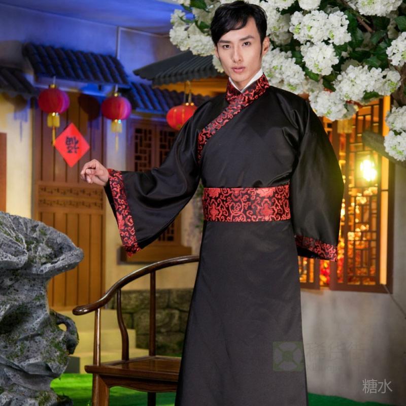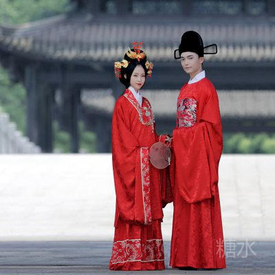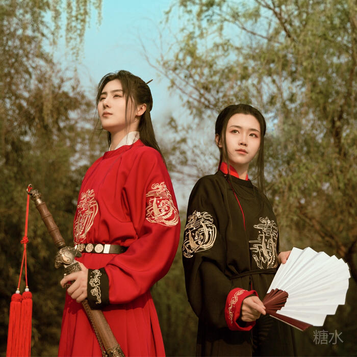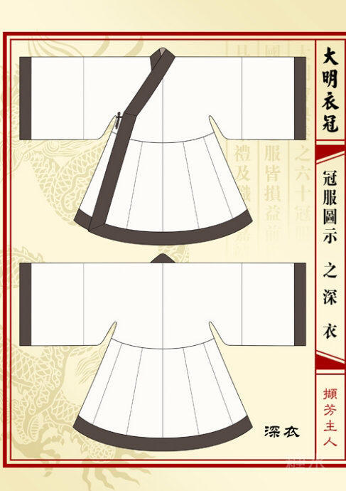 自隋唐开始盛行的圆领衫(唐太宗李世民所穿)延续了唐、五代、宋、元朝、明,并影响了日本、朝鲜等国。常见的宋太祖、明太祖画像中所穿均是这个类型服饰。至今日本天皇出席某些场合穿的服饰就是这种汉服的变种。注意这种圆领袍衫也是右衽的,在右肩附近用圆形小扣系紧。 经过元代蒙古人统治之后,明朝恢复汉族的传统,明太祖朱元璋重新制定了服饰制度。明代许多男子流行的发式都是明太祖首创的。比如「网巾」,有象征国家法令齐全的意思,「四方巾」象征国家太平,还有「瓜皮帽」,它几乎被现代的西方人当作中国典型的帽子了。服饰发展到明代,最突出的特点是以前襟的纽扣代替了几千年来的带结。但是纽扣并非始于明代,从元代的辫线袄子腰围部分曾经见到过钉纽扣的形式。纽扣的使用也是一种变革,体现着时代的进步。 明装与唐装相比,在于衣裙比例的明显倒置,由上衣短下裳长,逐渐拉长上装,缩短露裙的长度。衣领也从宋代的对领蜕变成以圆领为主。戴乌纱帽、身穿盘补服是明代官吏的主要服饰,以补子来区分官职。这种袍服是明代男子的主要服式,不仅官宦可用,士庶也可穿着,只是颜色有所区别。平民百姓所穿的盘领衣必须避开玄色、紫色、绿色、柳黄、姜黄及明黄等颜色,其他如蓝色、赭色等无限制,俗称“杂色盘领衣”。明朝建国二十五年以后,朝廷对官吏常服作了新的规定,凡文武官员,不论级别,都必须在袍服的胸前和后背缀一方补子,文官用飞禽,武官用走兽,以示区别。