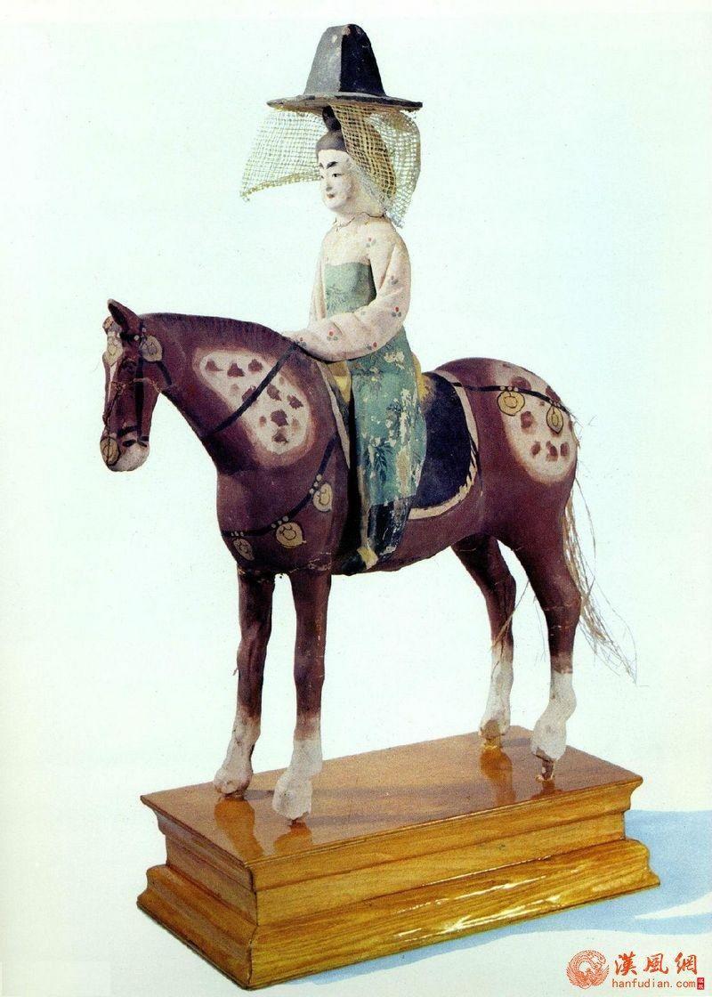 魏晋时期妇女服装承袭秦汉的遗俗,并吸收少 数 民族服饰特色,在传统基础上有所改进,一般上身穿衫袄襦,下身穿裙子,款式多为上俭下丰,衣身部分紧身合体,袖口肥大,裙为多折裥裙,裙长曳地,下摆宽松,从而打到俊俏潇洒的效果加上丰盛的首饰,反映出奢华糜丽之风此图为穿汉化衣裙的贵妇。