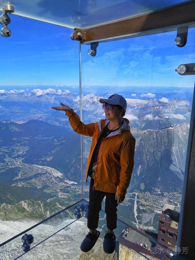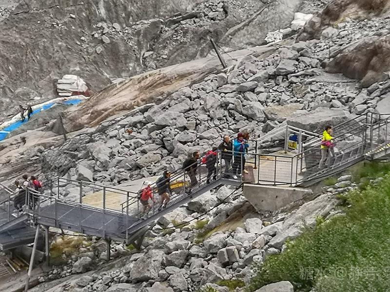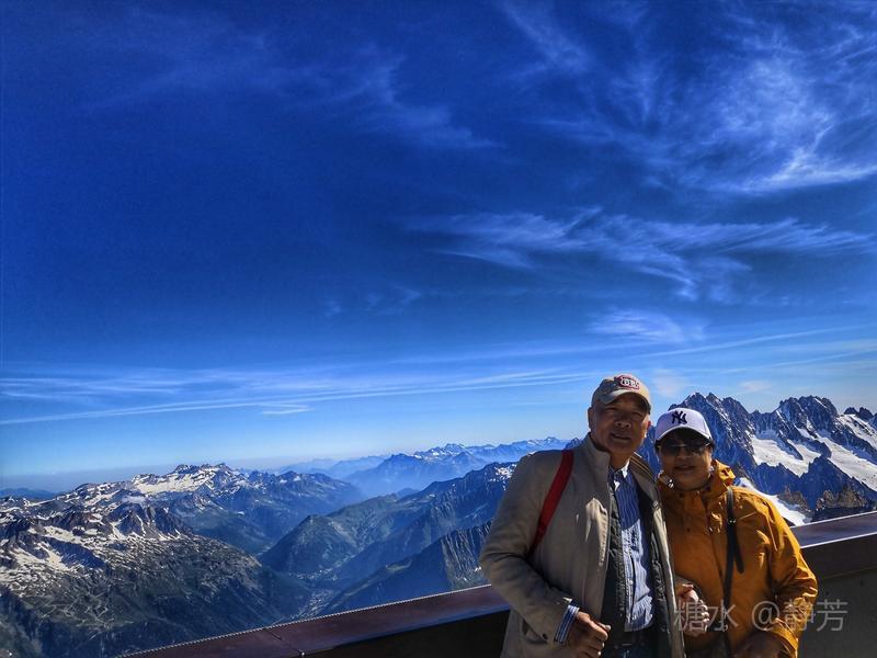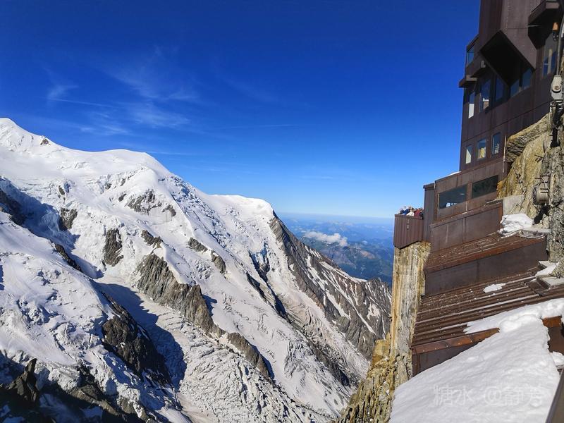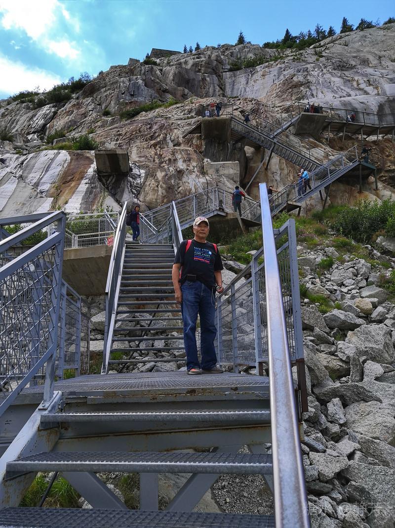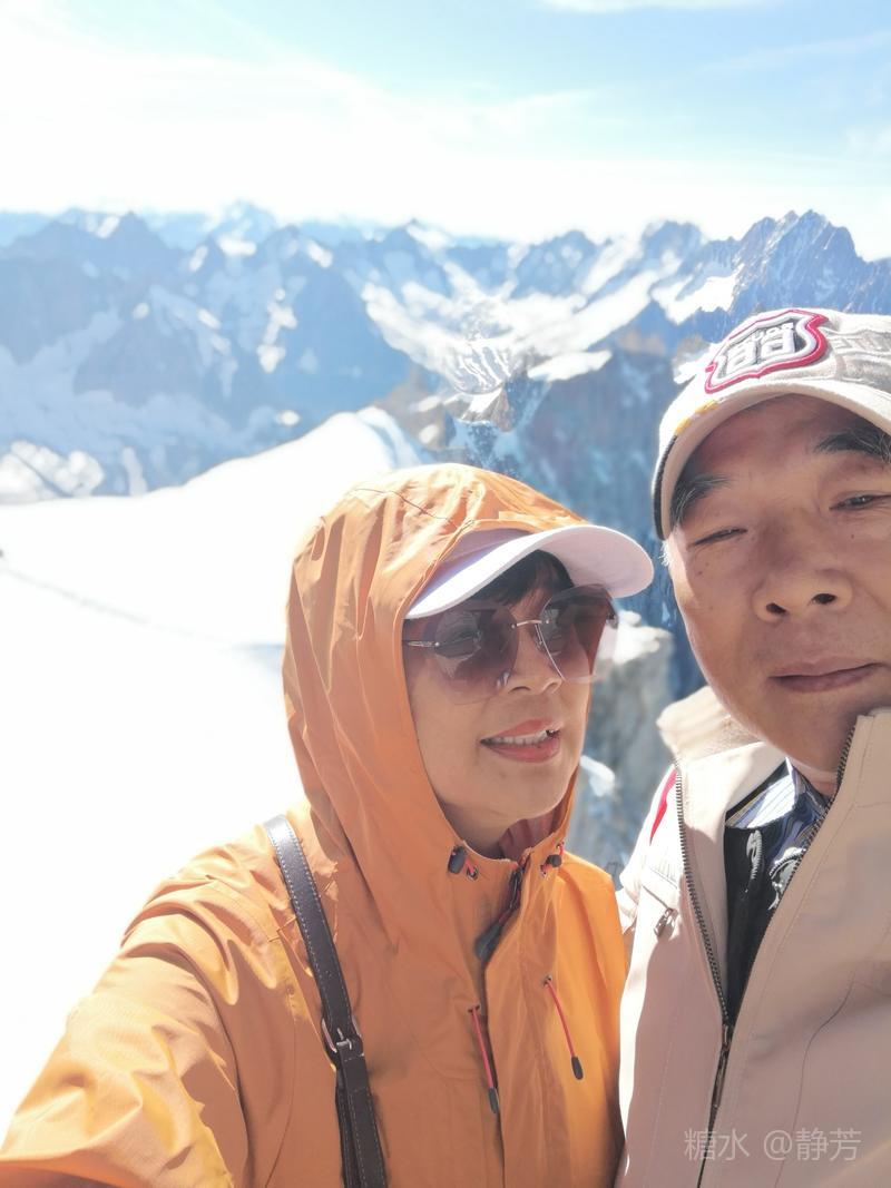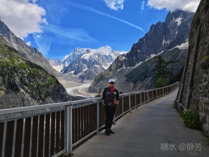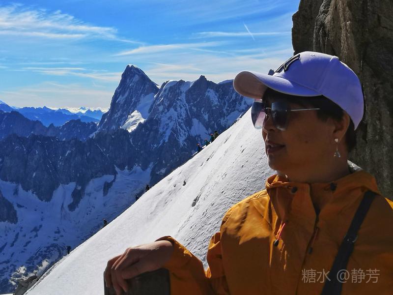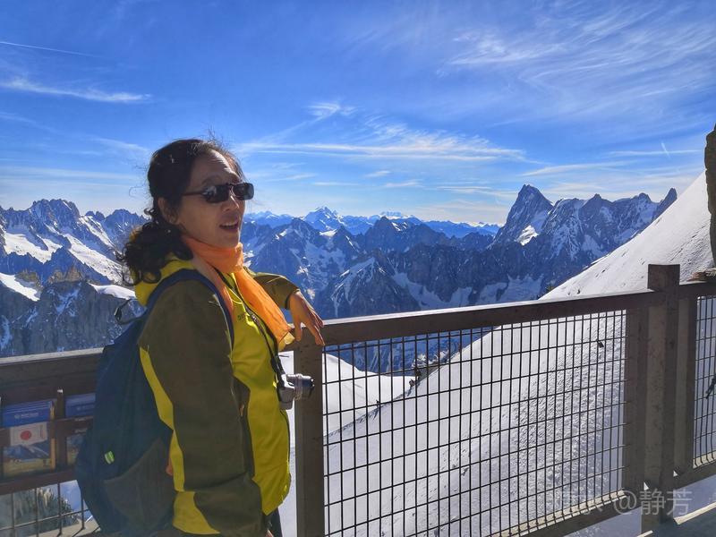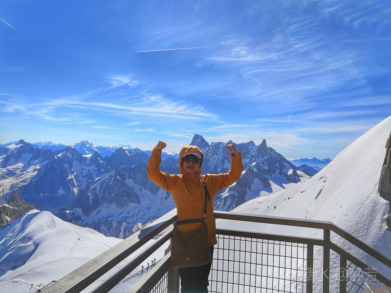 从第一个平台继续往上走,到了新的高度的平台,除了登山者,我们不能再上去了。 距离勃朗峰更近了,往下望我们刚才呆过的平台,为自己点赞。 同行朋友有高反,头疼,心跳快,我还可以。