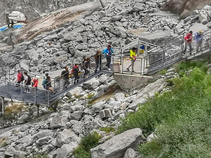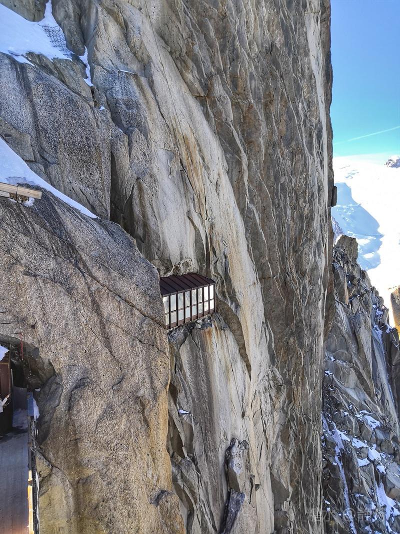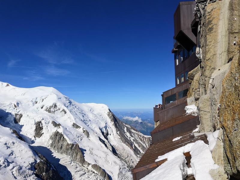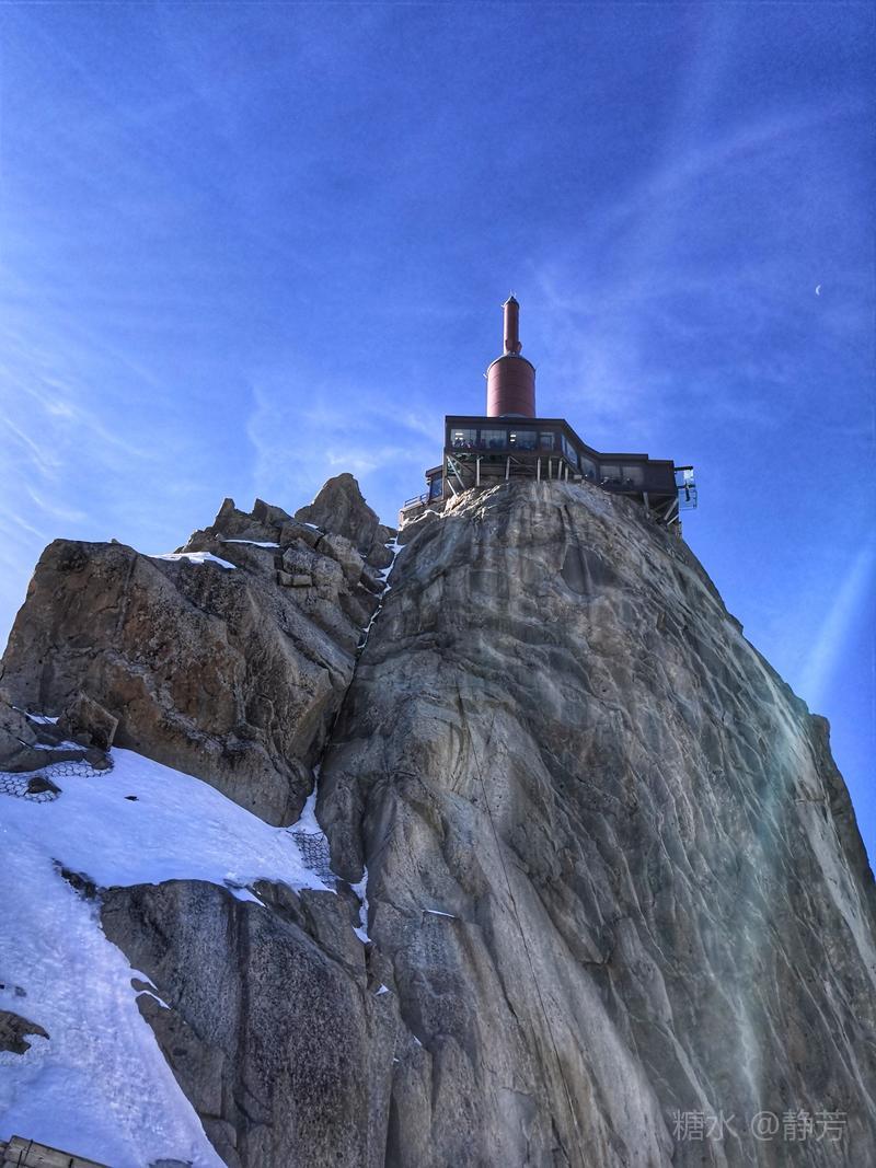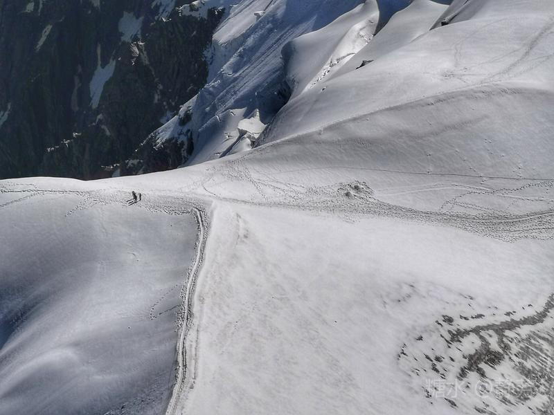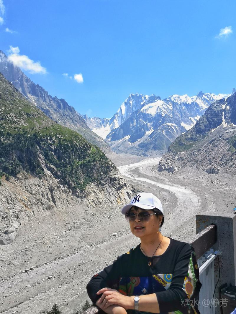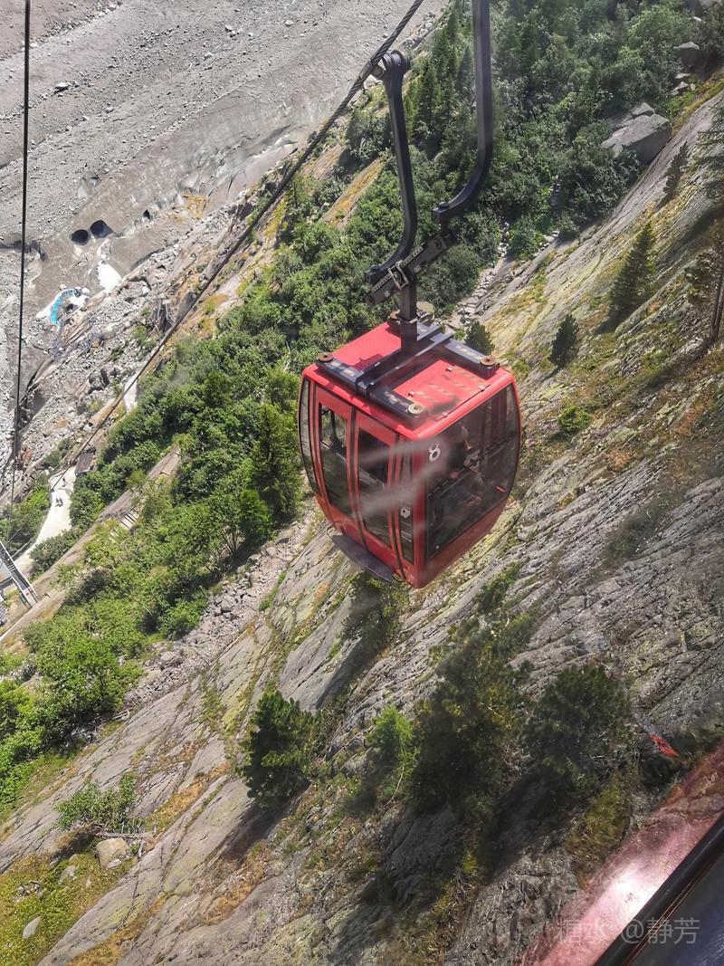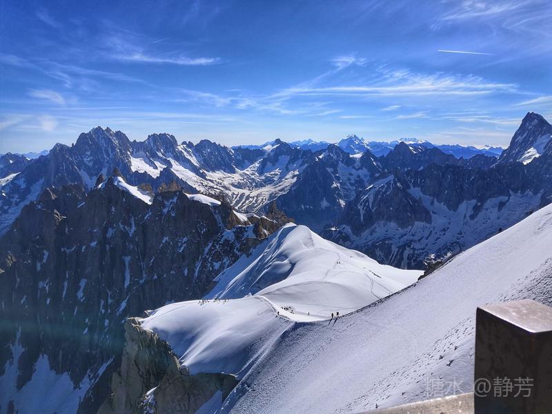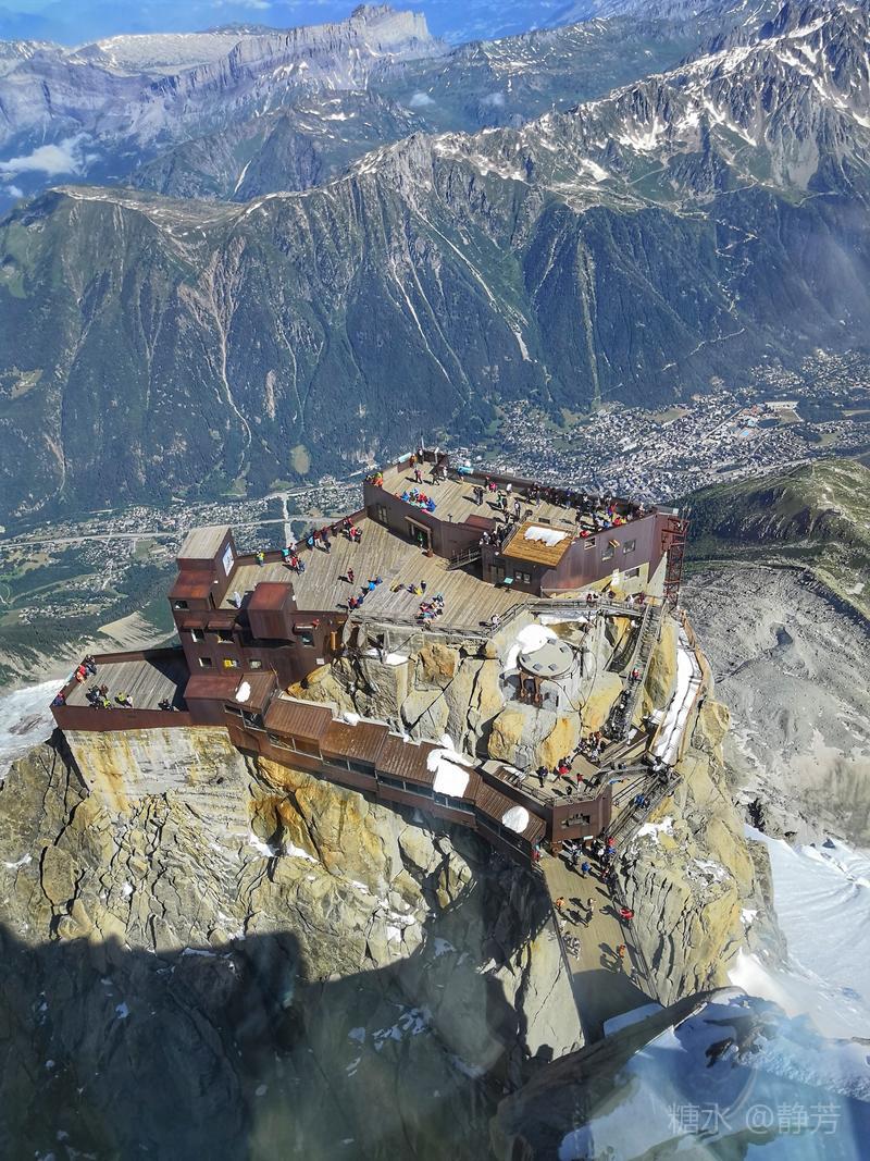 从第一个平台继续往上走,到了新的高度的平台,除了登山者,我们不能再上去了。 距离勃朗峰更近了,往下望我们刚才呆过的平台,为自己点赞。 同行朋友有高反,头疼,心跳快,我还可以。