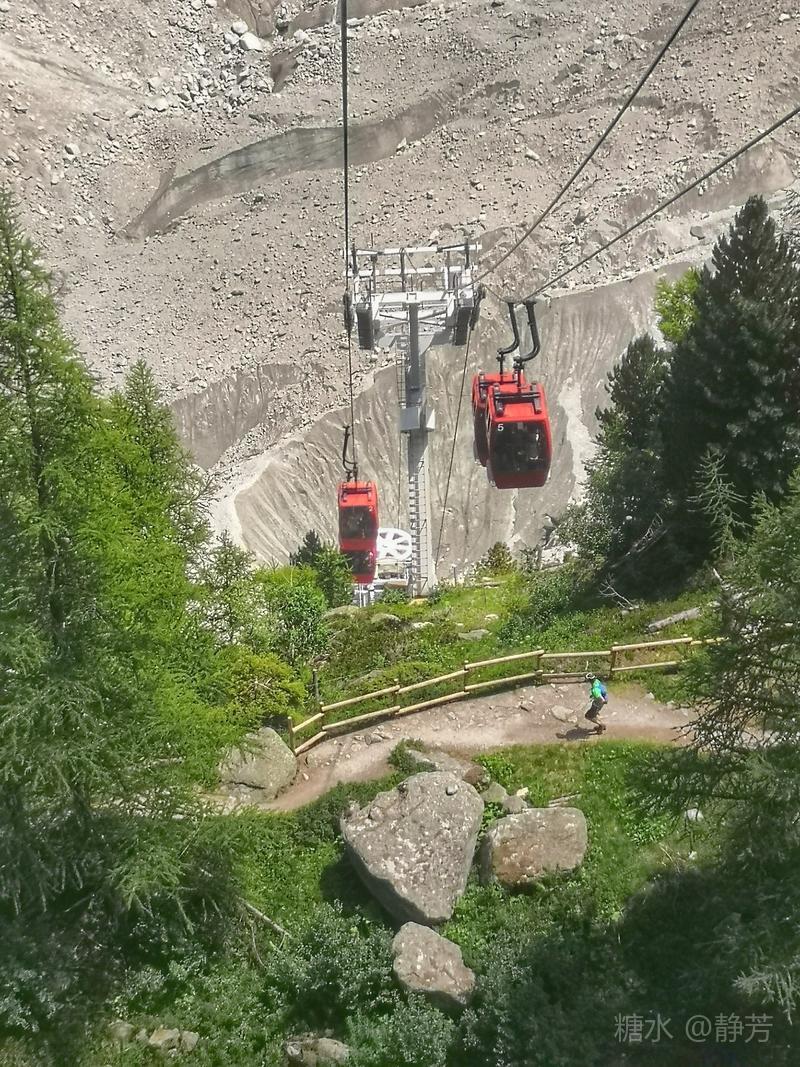 缆车站下的两座山脉间就是那条著名的大冰川Glacier de la Mer de Glace,这个长14km宽1800m深400m的史前冰川,是阿尔卑斯山脉第二大冰川,呈S型蜿蜒的从远方流过来,流到我们面前戛然而止。