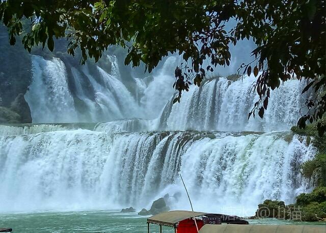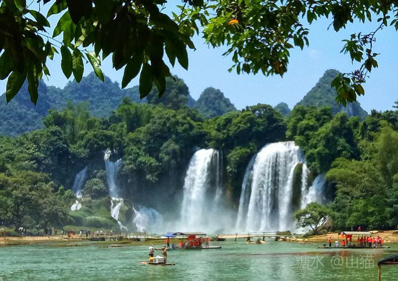 广西德天大瀑布位于中越边境,是亚洲第一、世界第二大的跨国瀑布,清澈的归春河是中越边境的国界河,河中乘坐大伐子的是中国游客忙着观赏风景,撑小船的是越南边民忙着向中国游客兜售商品。
