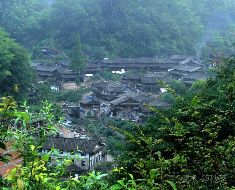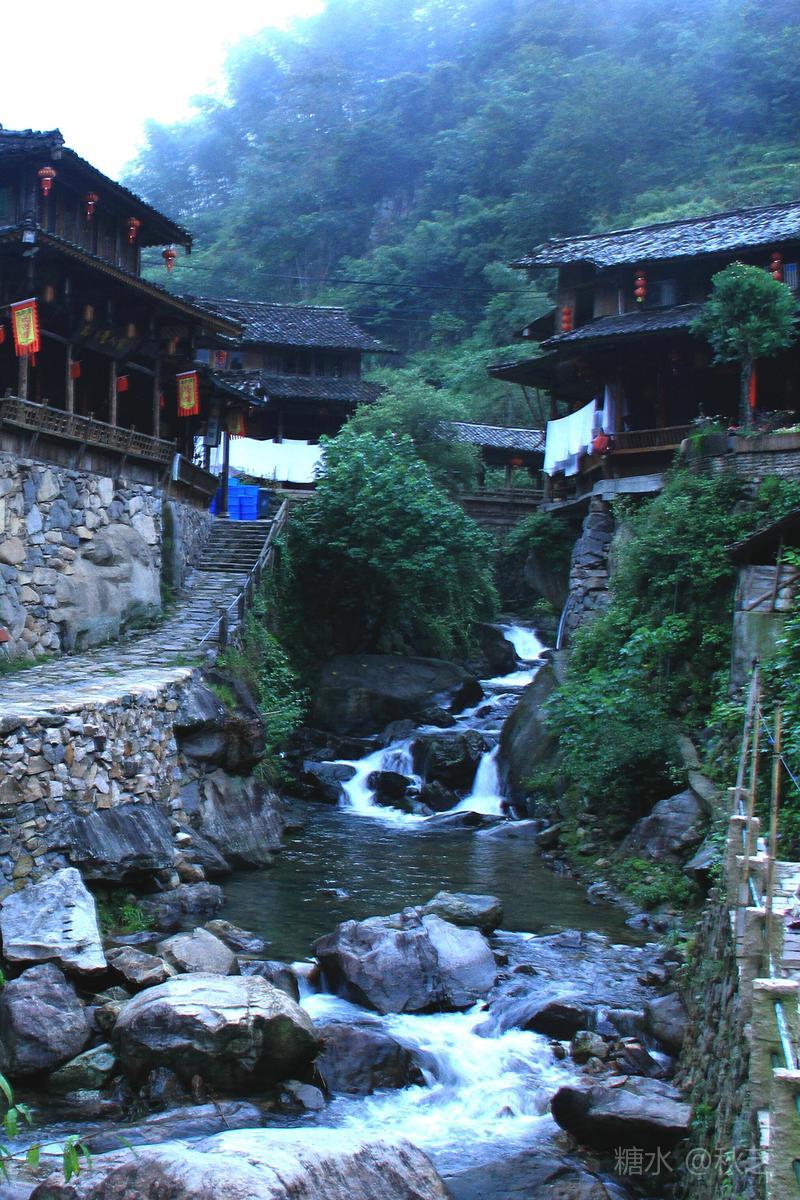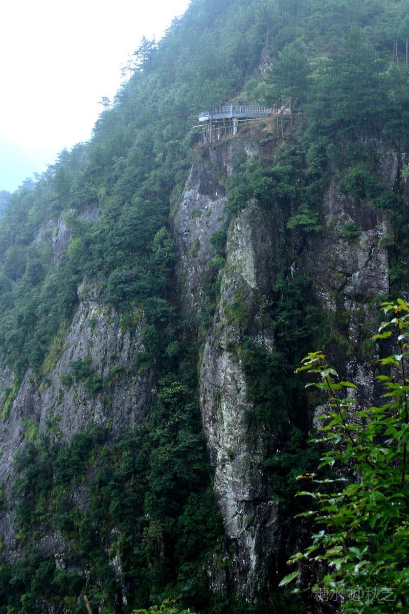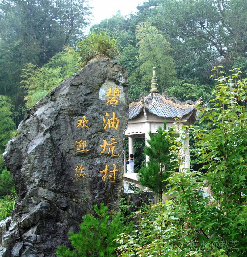 来到碧油坑村口,烟雨亭突兀在悬崖之上,旁边巨石上醒目写着:碧油坑村,欢迎您!它是瀑布顶上的一个古村落,也是深藏在崇山峻岭中的世外桃源,这里四面环山,从上往下看,瀑布飞泻而下,有点望不到底的感觉,我们去时正好下着雨,云雾弥漫,瀑布更显得虚无缥缈,带我们进入了另一种境界。