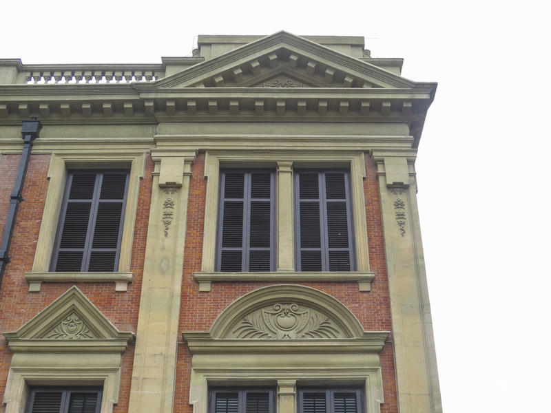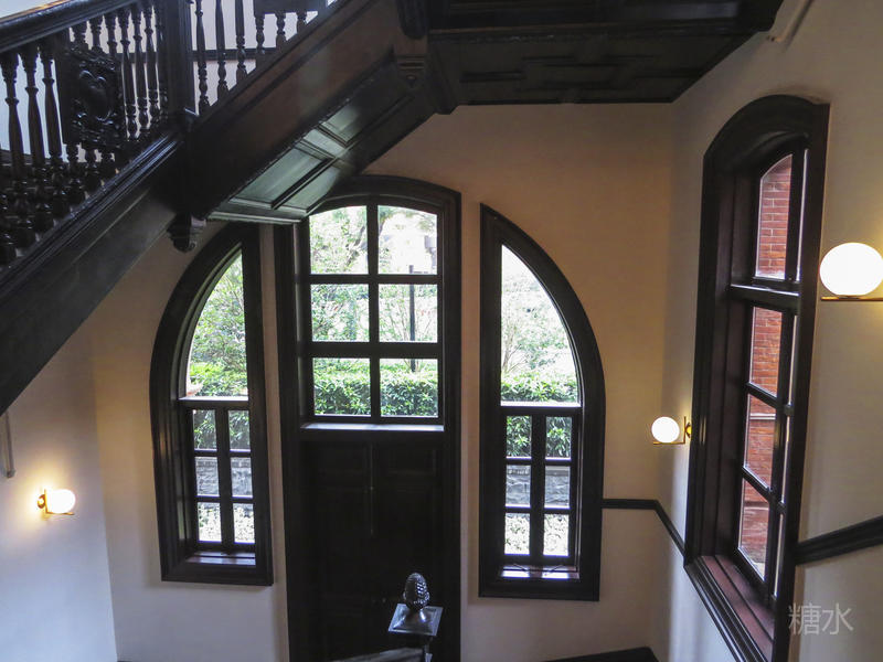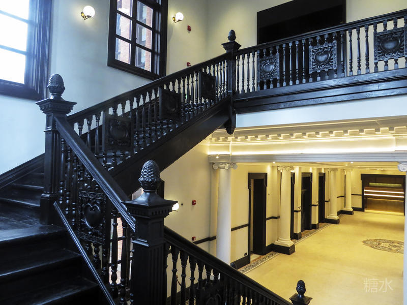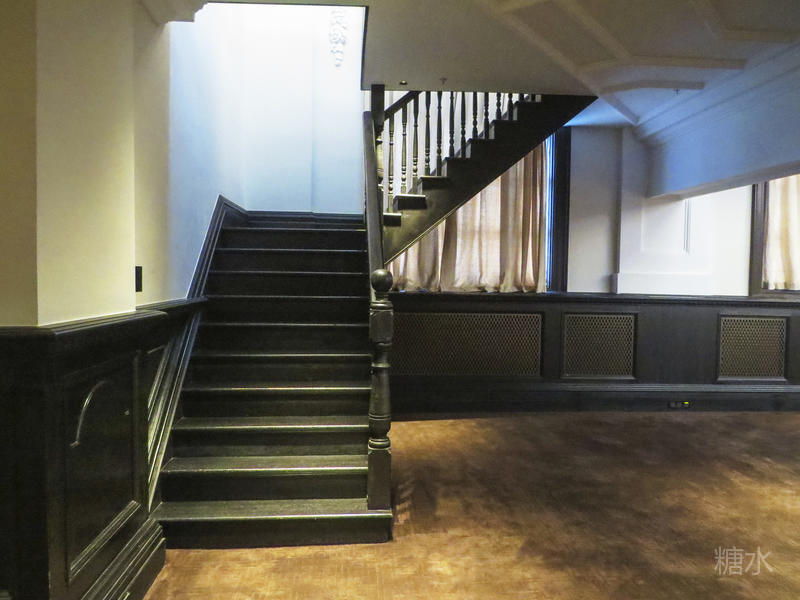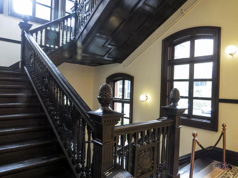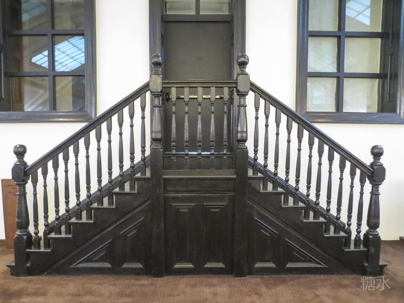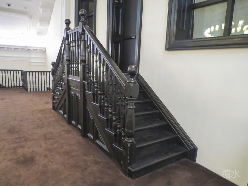 木楼梯为三跑大楼梯,柱头形态饱满,花饰栏杆上镶板样式精美,与建筑立面窗山花风格一致。