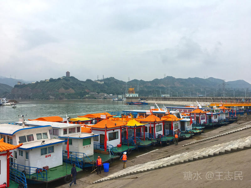 刘家峡水电站大坝,坝边停满了各式各样的游船,奇怪的是这里的水是清的,不黄。