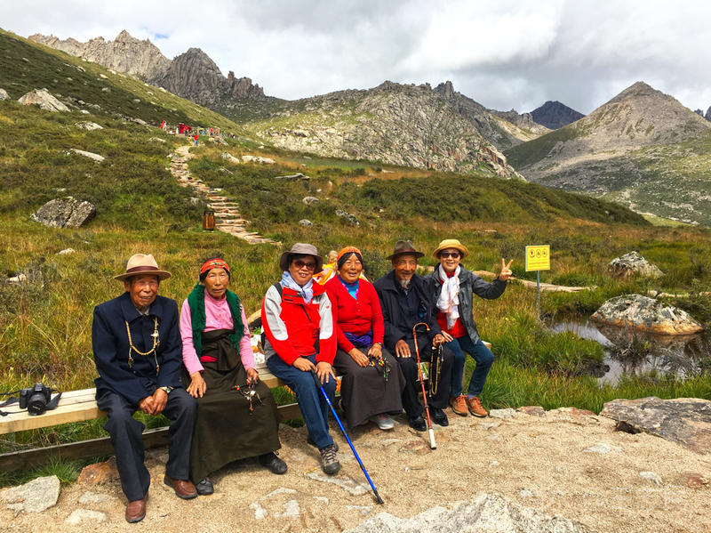 这些藏族人来自松潘的黑水河(毛儿盖)地区,两个男的都是七十,八十多岁的老人了。毕竟是高原上长大的人。看上去比我们轻松么。来个合影吧……