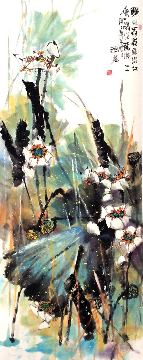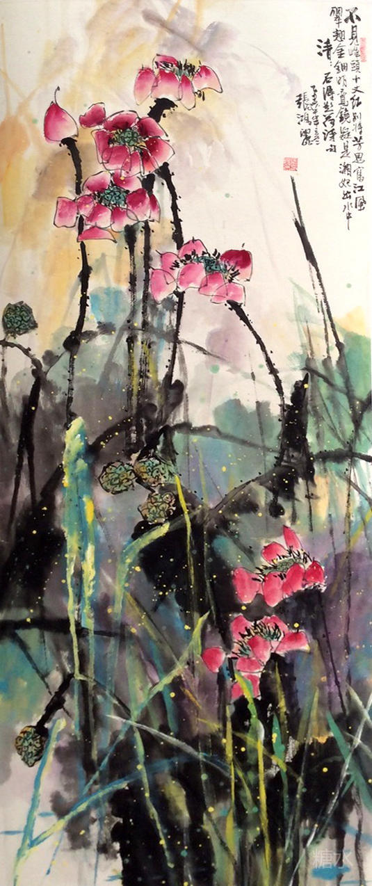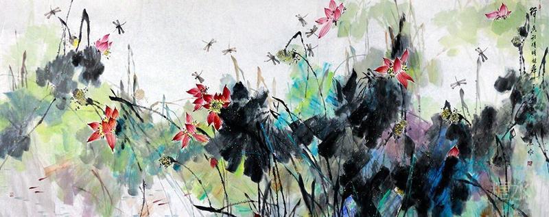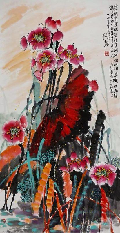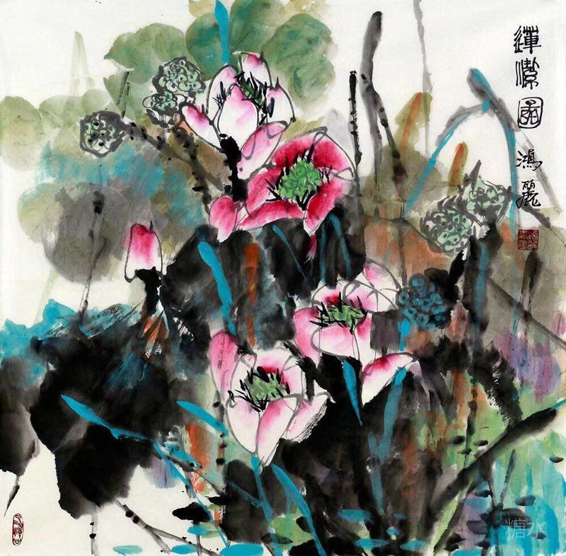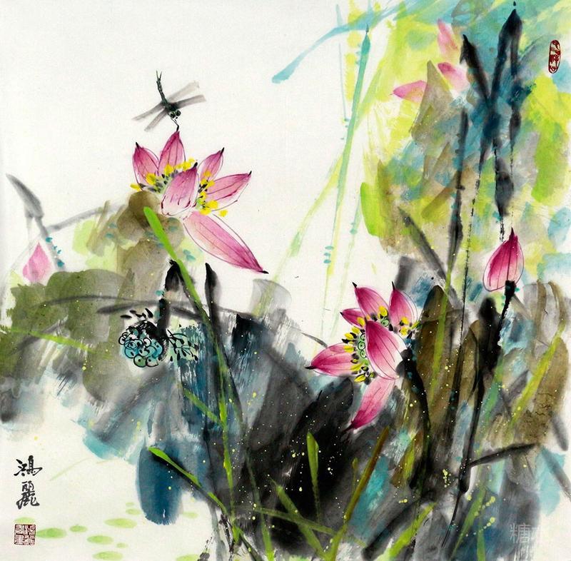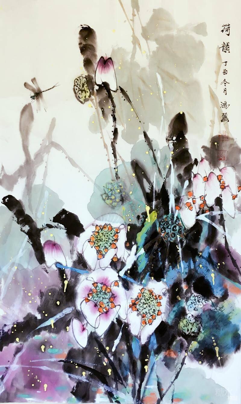 一花一世界、鸿丽画荷 荷花的出现在我国有着悠久的历史。早在三千年前的巜诗经》上就有"彼泽之陂,有蒲菡萏""山有扶苏,阴有荷华"的记载。荷在人们心目中是圣洁的化身、出淤泥而不染,享有花中君子的美誉。 我热爱荷花,更喜欢描绘荷的美丽。每逢荷香飘飘的时节、我会带上写生的工具、踏上旅途,静静地守候在荷塘边,用心观察翻飞的蜻蜓,团团碧叶、粉嫩嫩的花朵、婷婷玉立的小花苞、淡淡的清香拥着我,令人心旷神怡!一幅幅心爱的作品跃然纸上。张大千说"画荷最易也最难"易是易入手,难是难得神韵。一语道破了画荷的关键所在。 我在画荷时把刘存惠教授的三十二字教学法灵活运用到作品中,即:水的运用,调色方法、行笔变化、笔触组合、浓淡干湿、虚实关系、疏密布局、任意构图。为我创作和写生作品提出了新的创作思路,并形成了自己的绘画风格。 在每次创作过程中,一直秉承李夜冰老师新六法论"以色代墨见其笔、色墨混用求其韵、线面结合含其骨、疏密有致观其势、有法无法取其度、有笔无笔重其神。"。 在创作时紧扣主题思想、融中国画色彩、西画色彩丶装饰画色彩为一体,融传统技法与形式构成为一体,程式化方法和导师们的新法为一体,笔,墨丶色,水,有机结合,缺一不可。 在几十年的绘画创作中,不断学习和完善,加强知识的积累,提高雅俗的鉴赏能力,经过多年的艺术积淀,经过自己心灵的酝酿,我的荷花系列作品己经形成了自己的有血有肉有思想灵魂有情感的艺术作品。并将传统与现代融入作品,创作了大量的新作,如"盛世花开、满塘和气、荷荷美美、莲花仙子、莲年有余、和为贵、龙鹤舞福......“等老百姓喜闻乐见的荷系列作品。 在今后的创作过程中要坚强传承,坚持创新,坚持"师造化,中心源"从生活中体验,从中西文化艺术融合及创作实践中观察、发现丶感悟、总结出色,墨、水、在国画创作中的表现形式,不断创作出富有生命力和感染力的新时代国画作品。 张鸿丽写於墨尚阁
