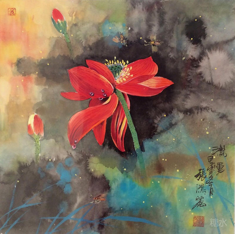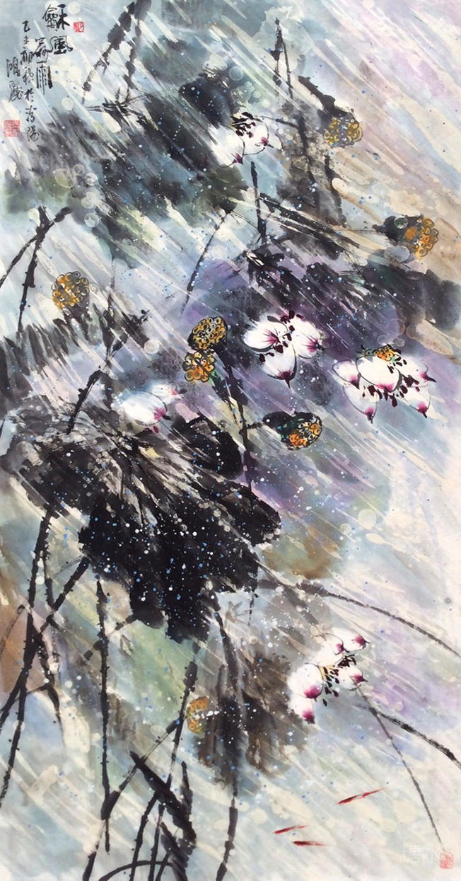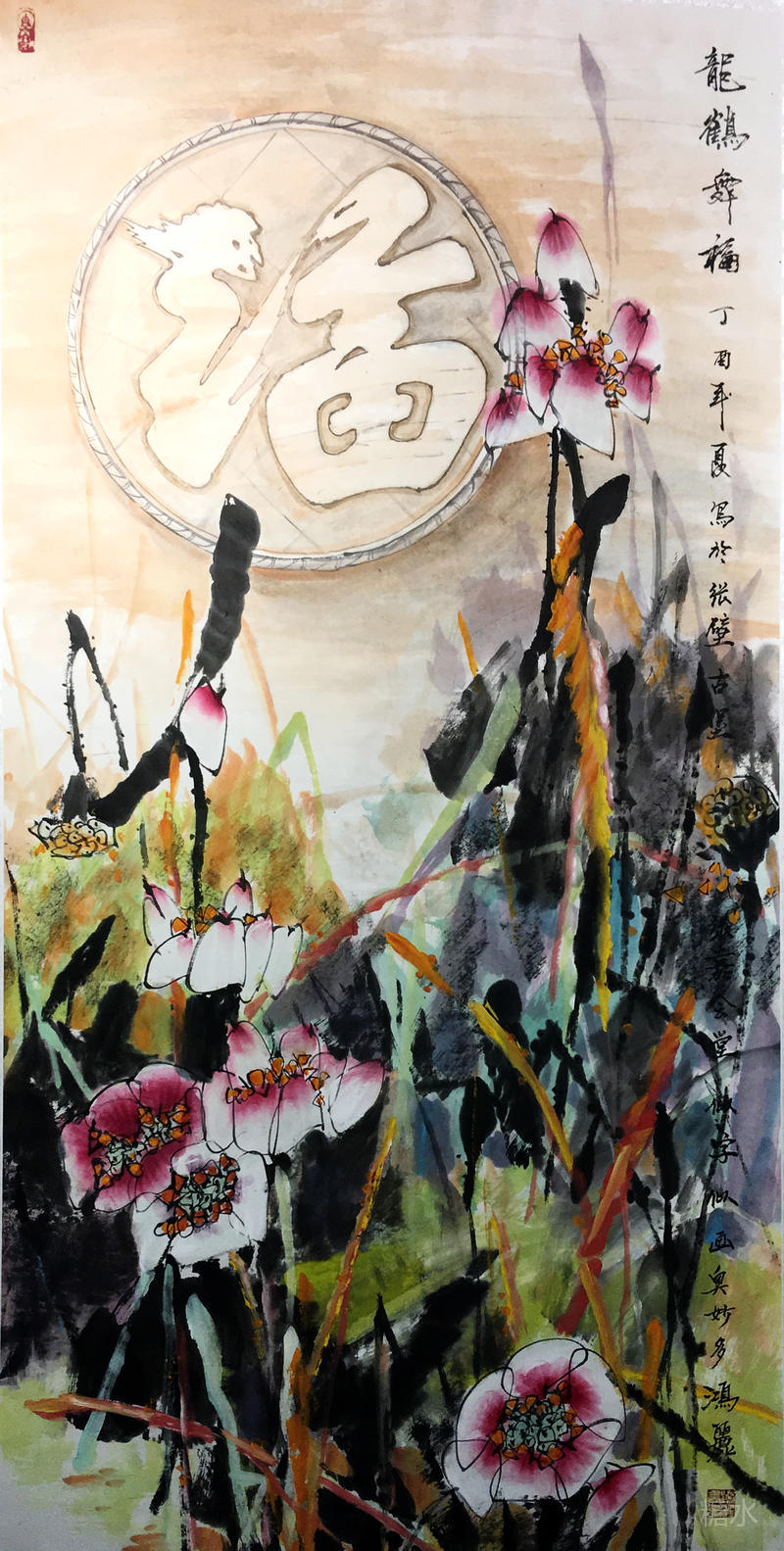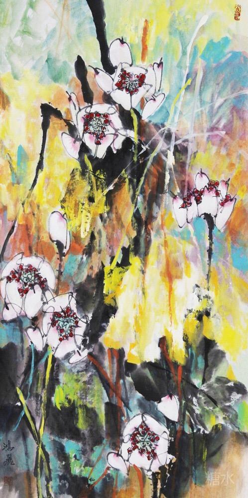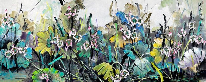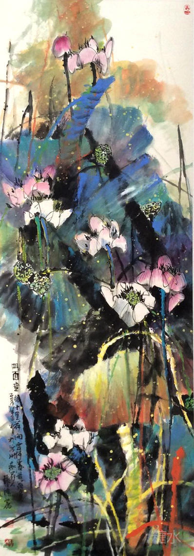 一花一世界、鸿丽画荷 荷花的出现在我国有着悠久的历史。早在三千年前的巜诗经》上就有"彼泽之陂,有蒲菡萏""山有扶苏,阴有荷华"的记载。荷在人们心目中是圣洁的化身、出淤泥而不染,享有花中君子的美誉。 我热爱荷花,更喜欢描绘荷的美丽。每逢荷香飘飘的时节、我会带上写生的工具、踏上旅途,静静地守候在荷塘边,用心观察翻飞的蜻蜓,团团碧叶、粉嫩嫩的花朵、婷婷玉立的小花苞、淡淡的清香拥着我,令人心旷神怡!一幅幅心爱的作品跃然纸上。张大千说"画荷最易也最难"易是易入手,难是难得神韵。一语道破了画荷的关键所在。 我在画荷时把刘存惠教授的三十二字教学法灵活运用到作品中,即:水的运用,调色方法、行笔变化、笔触组合、浓淡干湿、虚实关系、疏密布局、任意构图。为我创作和写生作品提出了新的创作思路,并形成了自己的绘画风格。 在每次创作过程中,一直秉承李夜冰老师新六法论"以色代墨见其笔、色墨混用求其韵、线面结合含其骨、疏密有致观其势、有法无法取其度、有笔无笔重其神。"。 在创作时紧扣主题思想、融中国画色彩、西画色彩丶装饰画色彩为一体,融传统技法与形式构成为一体,程式化方法和导师们的新法为一体,笔,墨丶色,水,有机结合,缺一不可。 在几十年的绘画创作中,不断学习和完善,加强知识的积累,提高雅俗的鉴赏能力,经过多年的艺术积淀,经过自己心灵的酝酿,我的荷花系列作品己经形成了自己的有血有肉有思想灵魂有情感的艺术作品。并将传统与现代融入作品,创作了大量的新作,如"盛世花开、满塘和气、荷荷美美、莲花仙子、莲年有余、和为贵、龙鹤舞福......“等老百姓喜闻乐见的荷系列作品。 在今后的创作过程中要坚强传承,坚持创新,坚持"师造化,中心源"从生活中体验,从中西文化艺术融合及创作实践中观察、发现丶感悟、总结出色,墨、水、在国画创作中的表现形式,不断创作出富有生命力和感染力的新时代国画作品。 张鸿丽写於墨尚阁