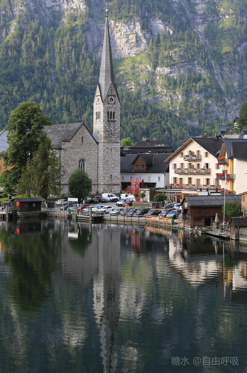 哈尔施塔特耶稣教堂(新教教堂)建于1785年,位于市政厅和码头旁,是小镇上的地标式建筑,具有哥特式风格,主塔的塔尖直指苍穹,仿佛能直接感触上帝的抚慰。从你踏入小镇开始,无论上山、下坡、走进任何一条小道,都能看见这个标志性的教堂塔尖,无处不在,绝对地标建筑。靠近教堂,会发现教堂并不大,平凡而简单,但是这样的淡雅和湖畔小镇相得益彰,连绵群山、彩色木屋、蓝色湖面,都是如此淡泊清新。