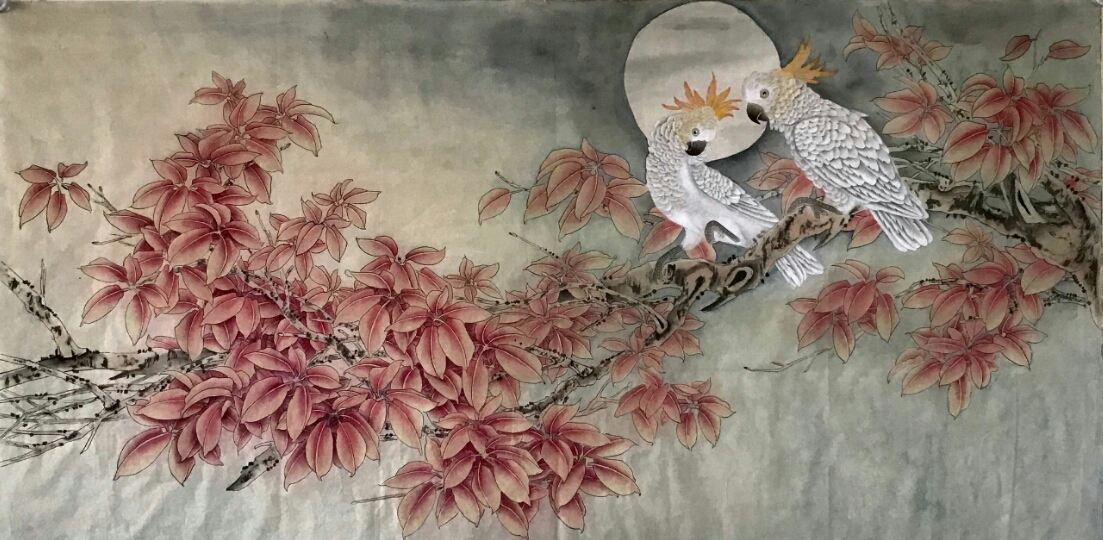 戊戌年仲秋节前夕完成四尺画作《红叶鹦鹉》,适逢佳节填词一阙《千秋岁·仲秋夜怀》并记。