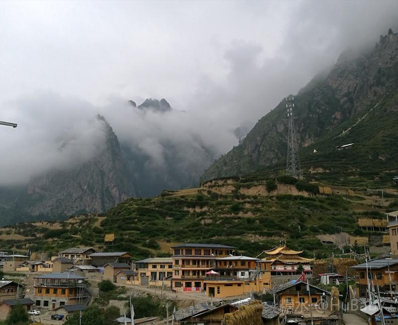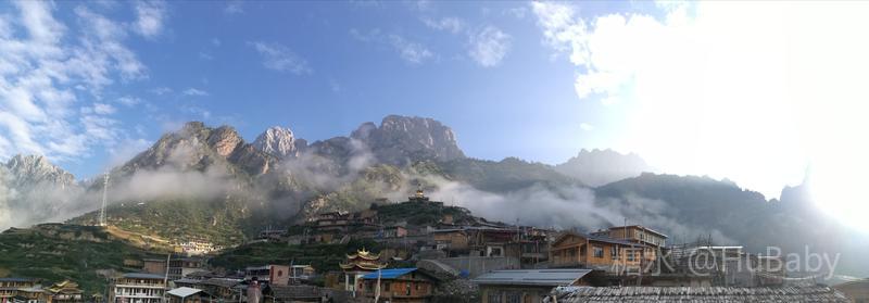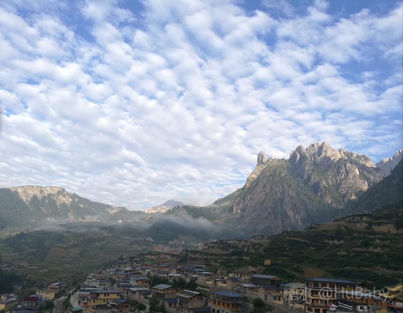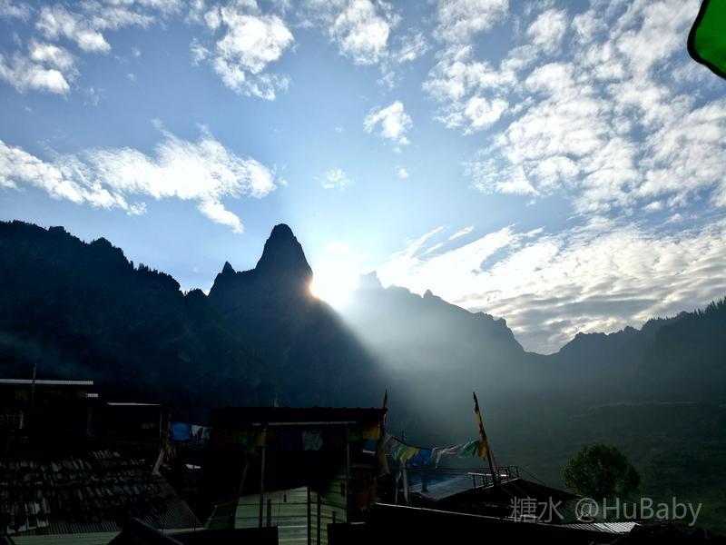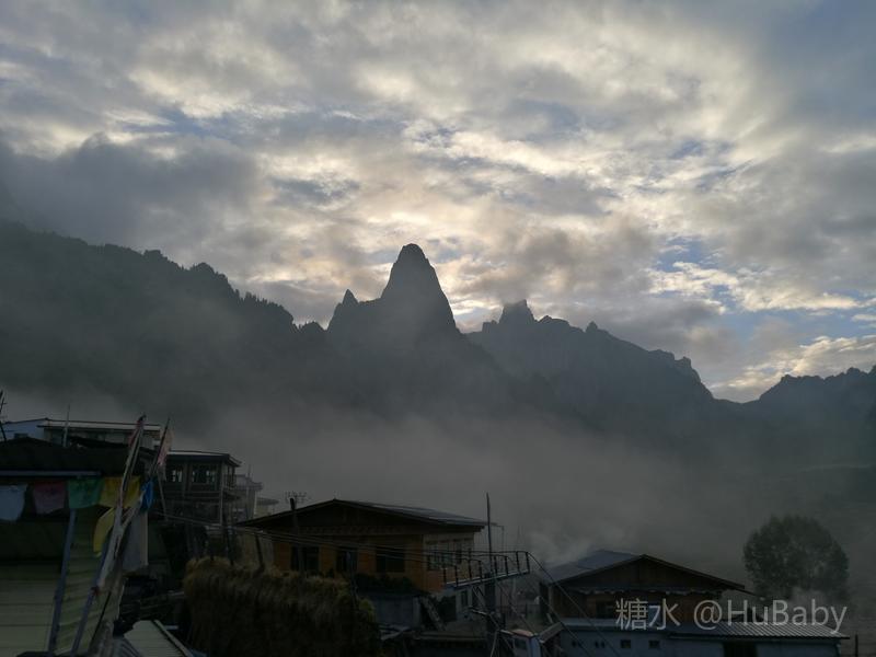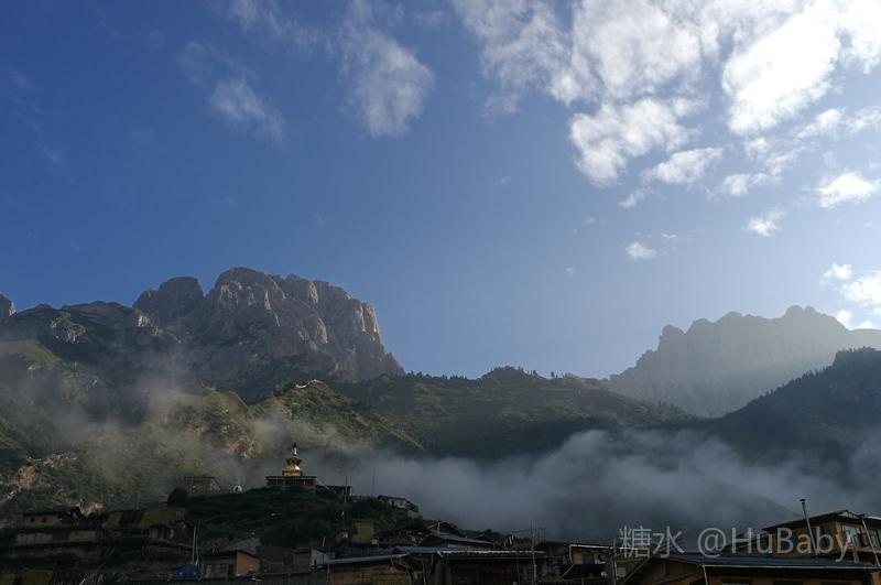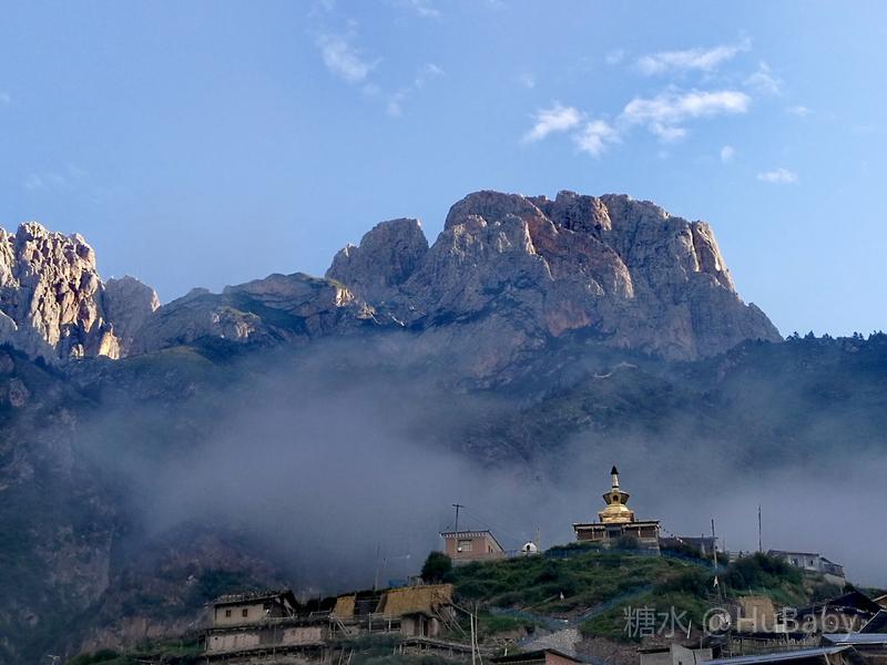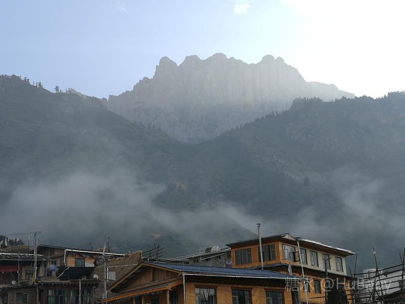 静候日出一片云 一夜阵雨,给朦胧的扎尕那增添了几分寒意。怀着侥幸心理,仍扶着冰冷的铁扶梯,爬上民宿湿漉漉的屋顶阳台。“独立寨群”的阳台视觉开阔:东面的石镜山、西面的东哇村就在眼前,左边拉桑寺、右边石门小道一目了然。将相机设在最适宜的参数,静候日出。 寨子里开始升起炊烟,山间也腾起缭绕的烟云,似乎一切都在慢慢地苏醒中。一会儿大片的云扑腾翻滚起来,浓缩成一条条纤细的云带,挂壁在远山的腰间,缠绕在近峰的尖顶。东面的石镜山黑成轮廓,山后的天空愈来愈蓝,接着一道道浅浅的光束射向天空。光束在扩散变亮,跟着就是一轮红日半遮半露地探出了头。阳光照亮了山峰、拉桑寺,也照亮了整个村庄,更照暖了我们冰冷的身体……