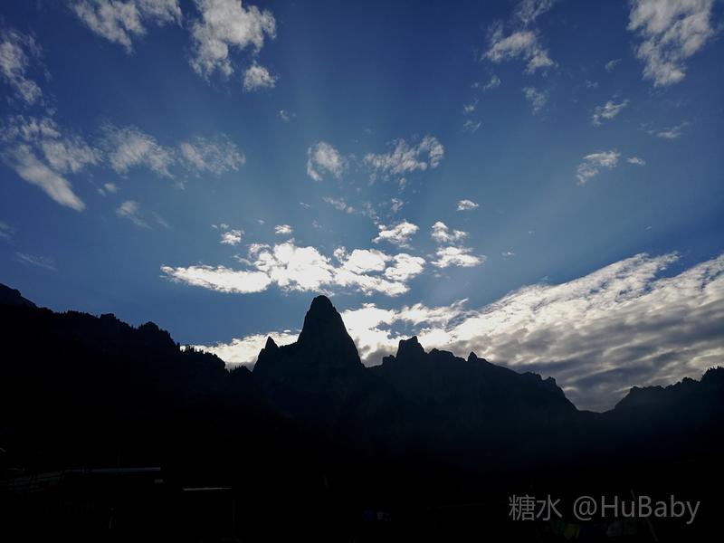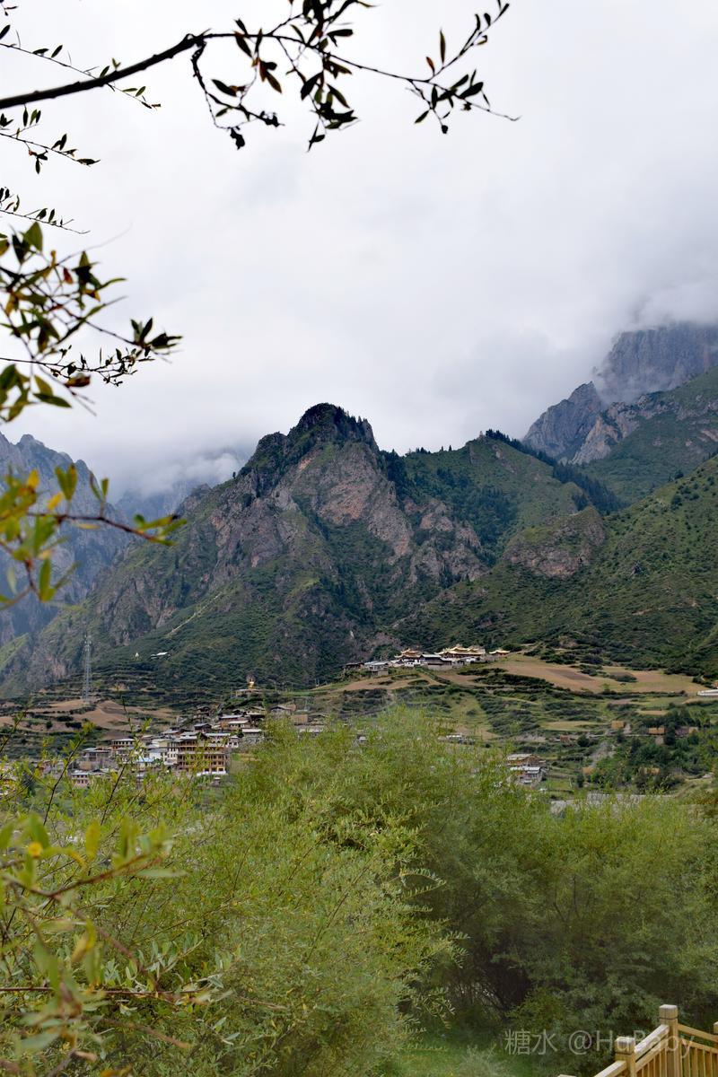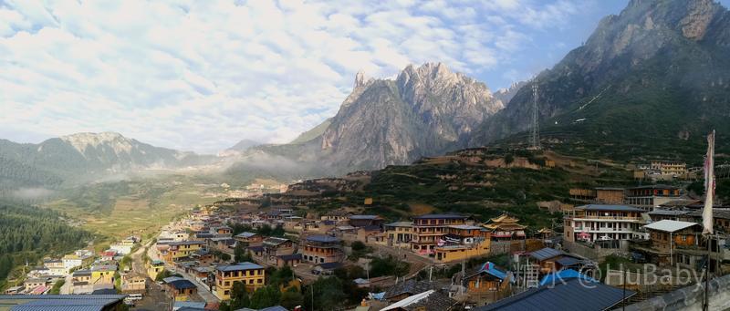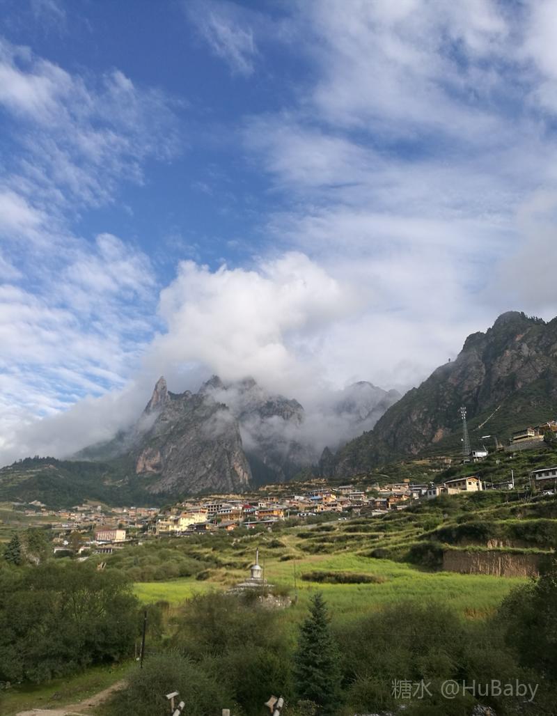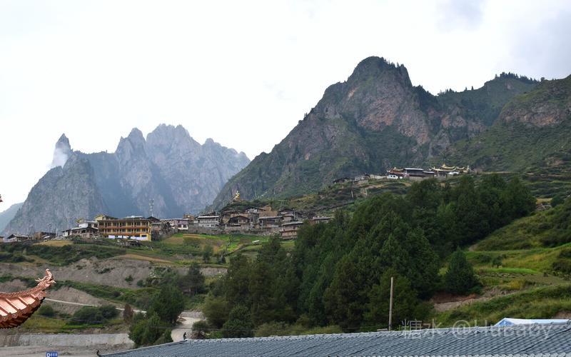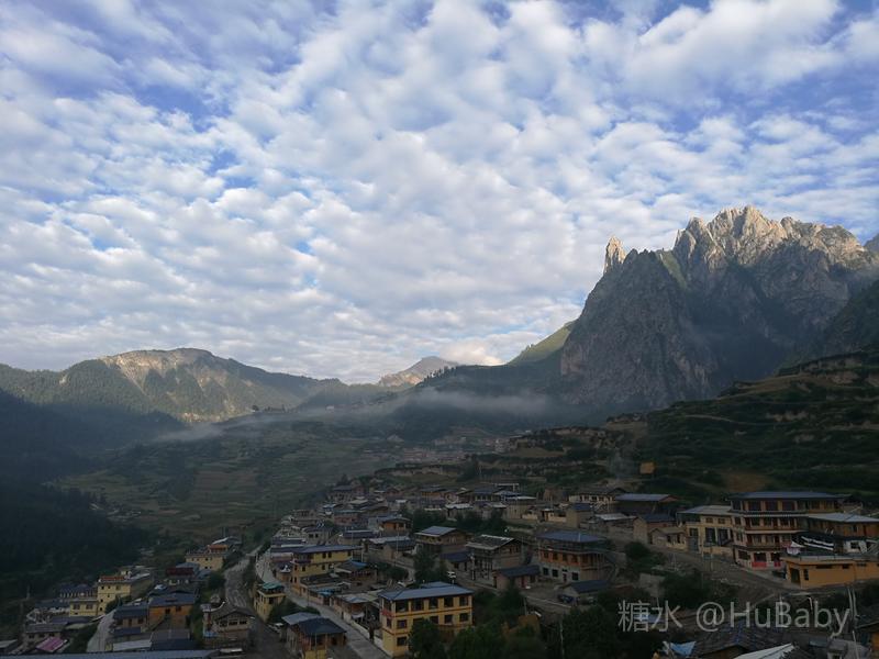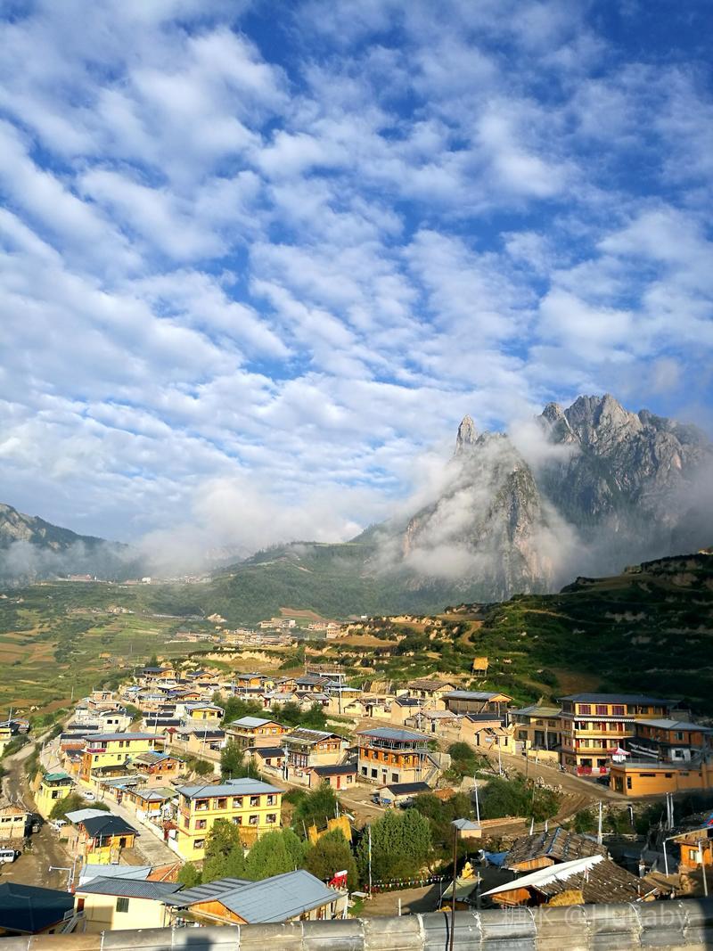 静候日出一片云 一夜阵雨,给朦胧的扎尕那增添了几分寒意。怀着侥幸心理,仍扶着冰冷的铁扶梯,爬上民宿湿漉漉的屋顶阳台。“独立寨群”的阳台视觉开阔:东面的石镜山、西面的东哇村就在眼前,左边拉桑寺、右边石门小道一目了然。将相机设在最适宜的参数,静候日出。 寨子里开始升起炊烟,山间也腾起缭绕的烟云,似乎一切都在慢慢地苏醒中。一会儿大片的云扑腾翻滚起来,浓缩成一条条纤细的云带,挂壁在远山的腰间,缠绕在近峰的尖顶。东面的石镜山黑成轮廓,山后的天空愈来愈蓝,接着一道道浅浅的光束射向天空。光束在扩散变亮,跟着就是一轮红日半遮半露地探出了头。阳光照亮了山峰、拉桑寺,也照亮了整个村庄,更照暖了我们冰冷的身体……