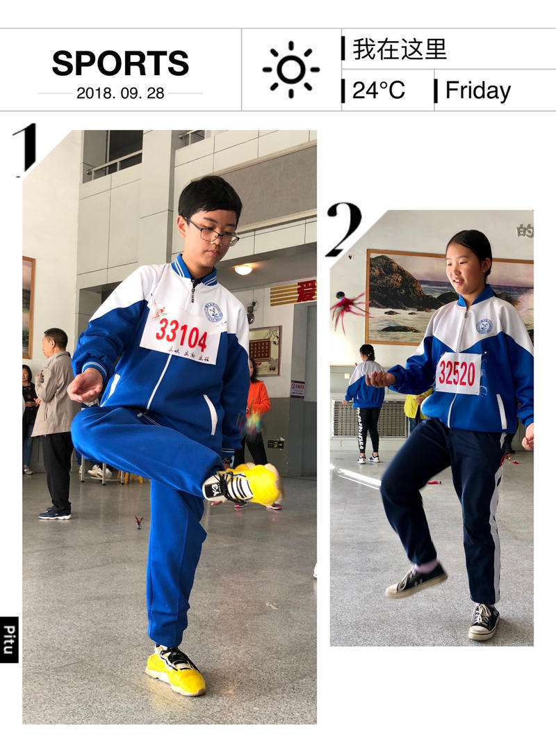 跳绳的同学姿态轻盈,上上下下,手中的绳子摇出五彩的光晕。踢毽子的同学腿脚敏捷,眼神专注,五颜六色的毽子在空中上下翩飞。