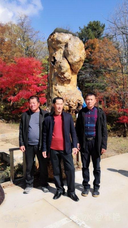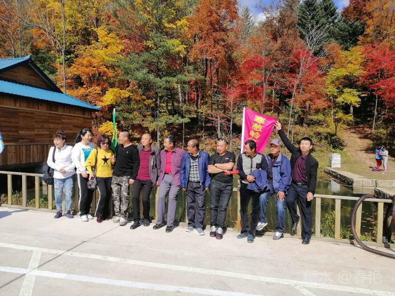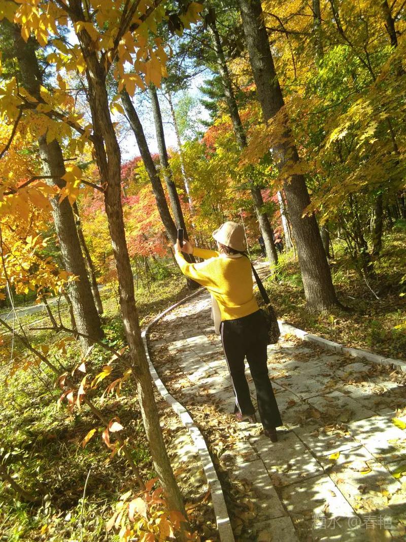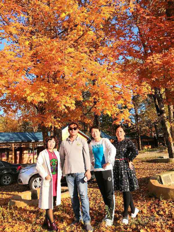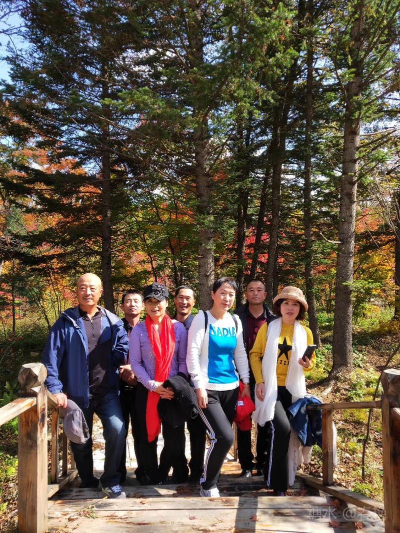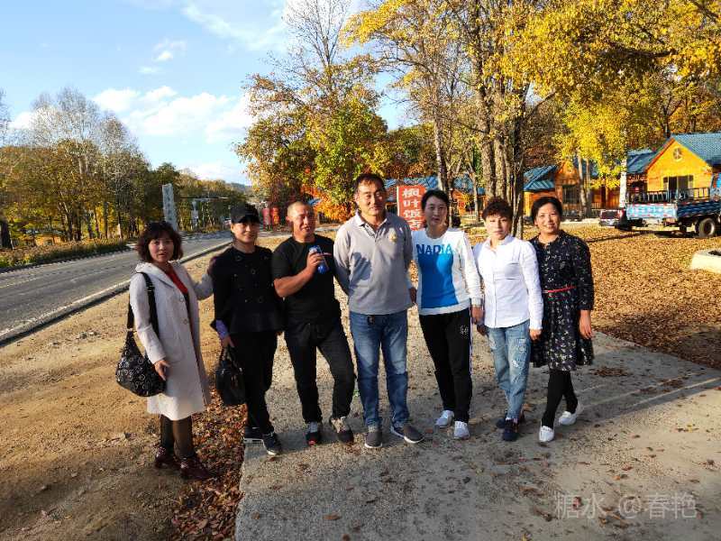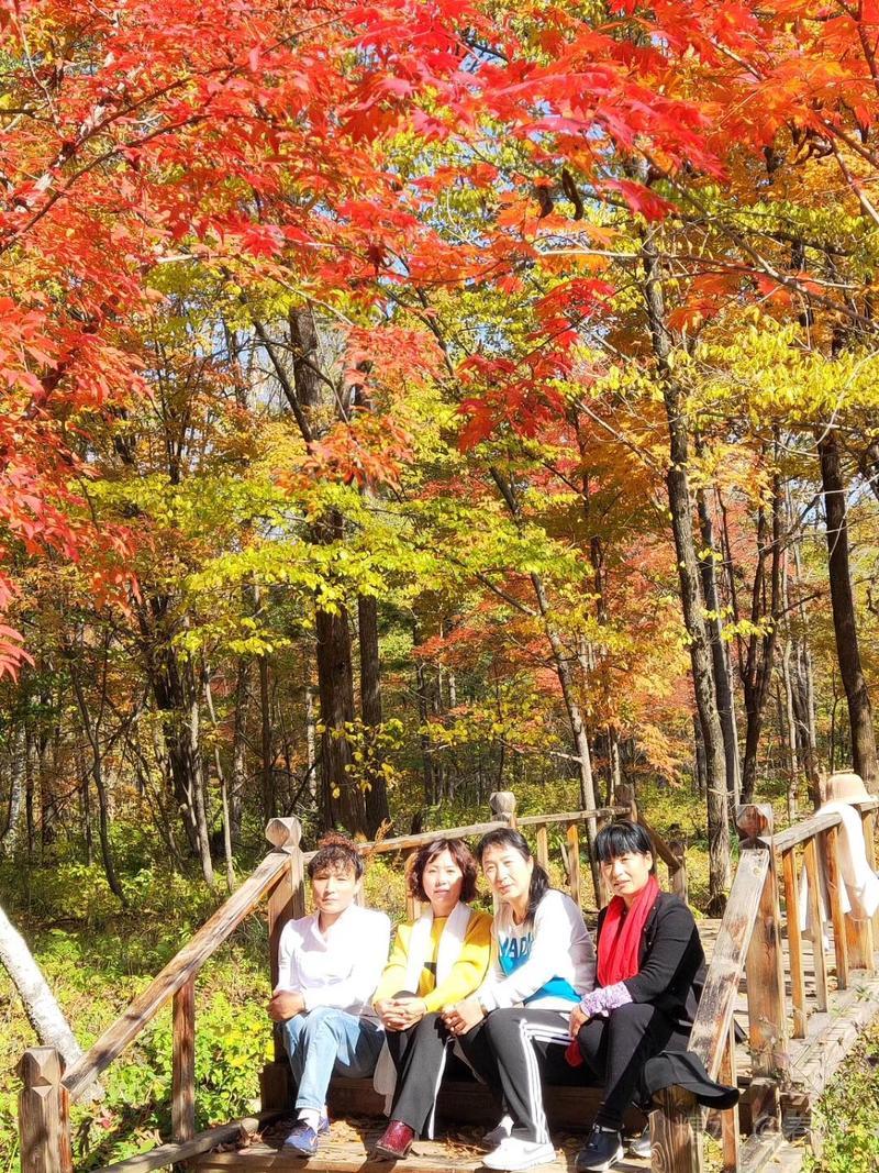 这里的大山是五彩山,像是画家画出的一幅水彩画,绿色的松树、红色的枫树、黄色的白桦树长满了山坡,大山就像穿了一条五彩斑澜的裙子,随着秋风翩翩起舞,许多树叶落下来发出“唰唰”地响声,好象在欢迎我们的到来。游客们都纷纷拍照、欣赏美景。