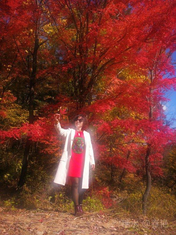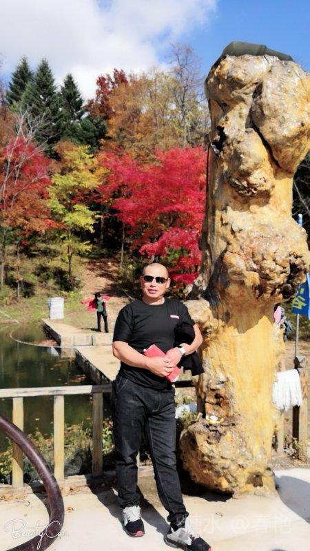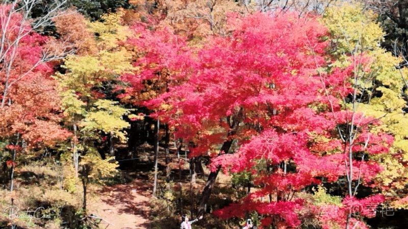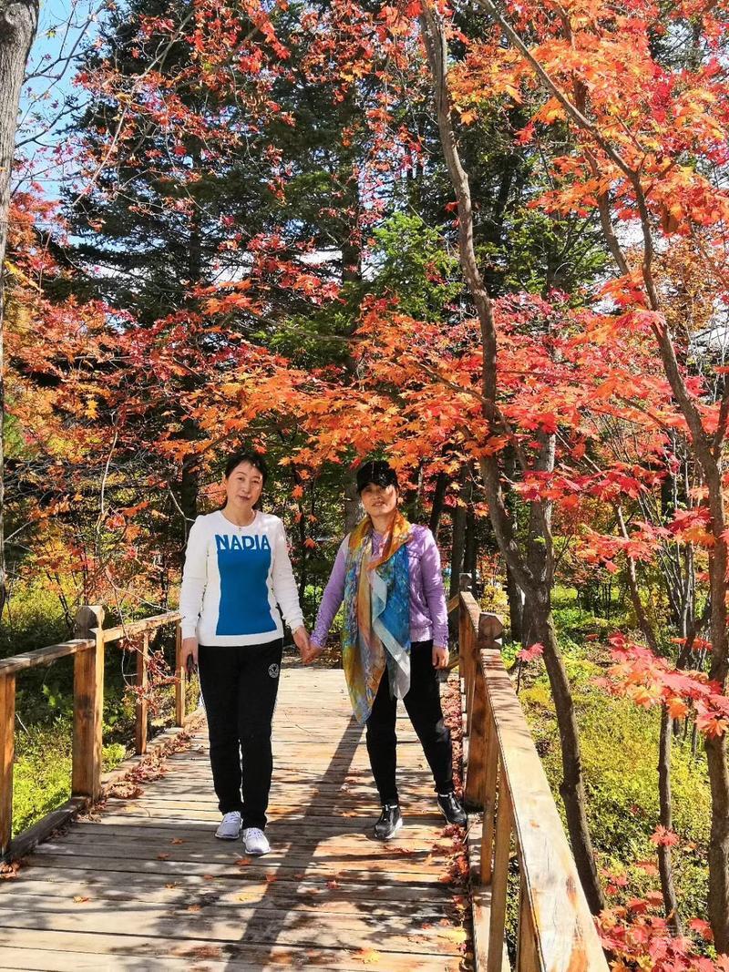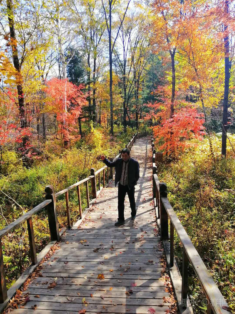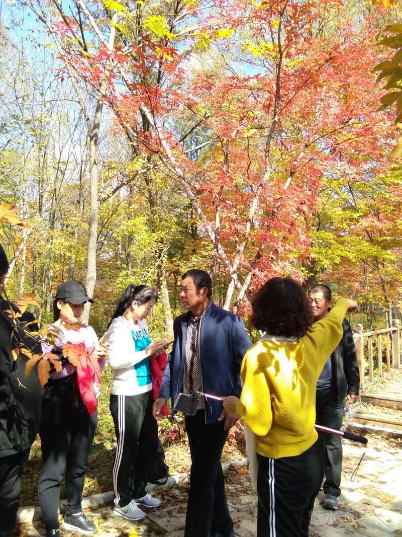 这里的大山是五彩山,像是画家画出的一幅水彩画,绿色的松树、红色的枫树、黄色的白桦树长满了山坡,大山就像穿了一条五彩斑澜的裙子,随着秋风翩翩起舞,许多树叶落下来发出“唰唰”地响声,好象在欢迎我们的到来。游客们都纷纷拍照、欣赏美景。