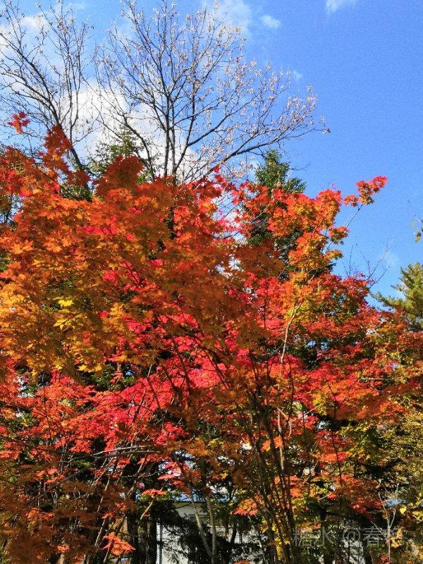 秋天天空像一块覆盖大地的蓝宝石。在红叶的交相辉映之下,格外美丽。