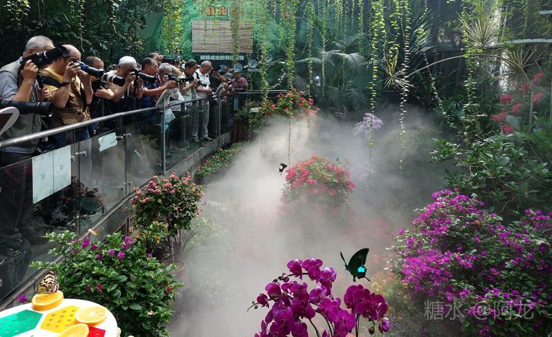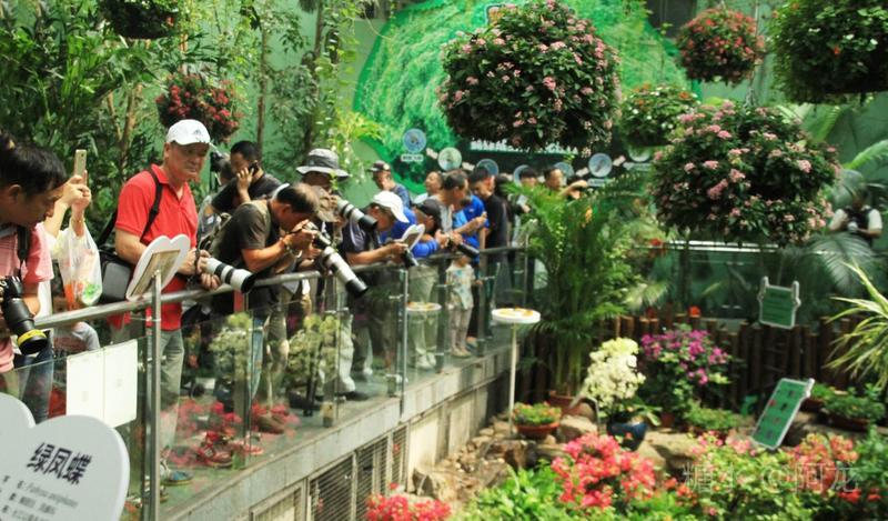 公园工作人员在放养蝴蝶,有人正在用手机拍摄。