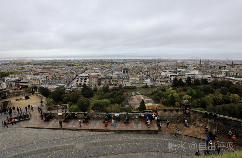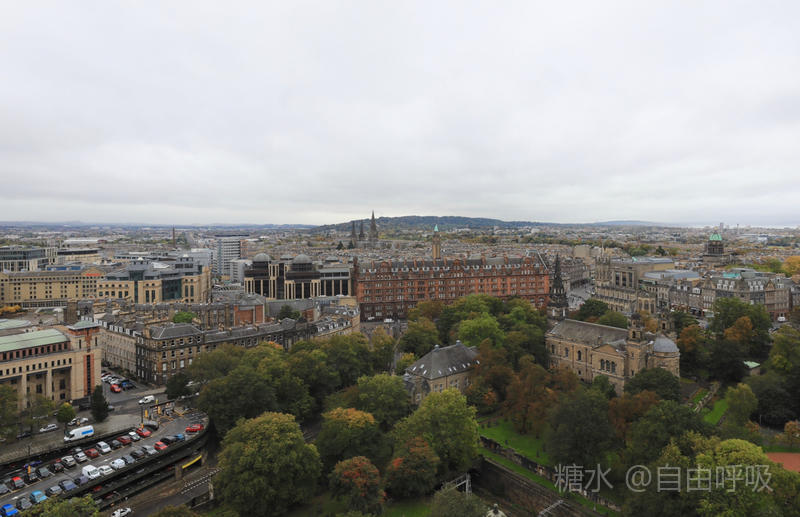 在城堡上俯瞰爱丁堡城,左下方是司格特纪念碑,右上方是卡尔顿山。