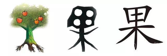 果[guǒ]:苹果的形象是圆的,就画个圆圈,里面不是空的是实的,里面就再加上一横一竖,苹果、李子、桃子、杏都是长在树上的,树的总称是木,所以下面加个木,表示苹果长在树上,果实都有一层外皮包裹,所以读音与裹相同。