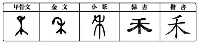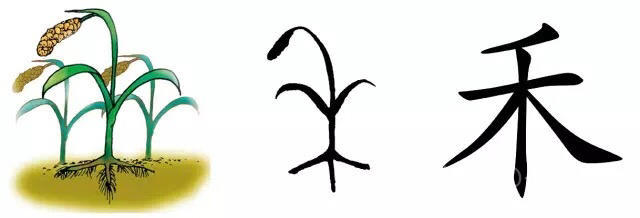 禾[hé]:农作物的通称,俗称庄稼,它跟树木一样,有主干、枝叶和根,所以它的下半截与树木相同,庄稼成熟以后分量重了,穗子就垂下来,就用一撇来表示,这就与木区别开了。这个字常用来组成另外的形意字、音意字,人们习惯称它为禾木。