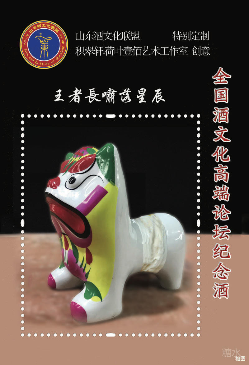 高峰论坛纪念酒——王者长啸落星辰。 编号:AWSU-004-2018 酒器由集翠轩.荷叶壹佰艺术工作室创意设计,广东潮州禧祺艺术陶瓷创作团队雕塑。 选用山东非物质物化遗产—泥老虎造型,虎头的“王”,寓意来自全国各地的学者、专家齐聚山东,为弘扬酒文化发出最强音,与山东酒文化联盟首届年会纪念酒形成一对。 酒器高19.5cm,最大宽度13cm,酒器部分长13cm。灌装65度800毫升山东宏源酒业有限公司佳酿。