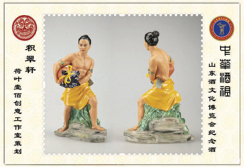 主题纪念酒——中华酒祖。 编号:AWSU-003-2018。 酒器由积翠轩.荷叶壹佰创意工作室创意设计,广东潮州禧祺艺术陶瓷创作团队雕塑,采用传统潮州彩瓷工艺,全部手工绘彩。 高31cm,灌装65度550毫升山东宏源酒业佳酿。 瓷雕创作年龄26—30之间,人物生活在夏商时期,人体采取古希腊雕塑的对理想美的追求,肌理和谐、细腻、自然,轻裾借鉴“曹衣出水”技法,是一件中西合璧的艺术雕瓷。