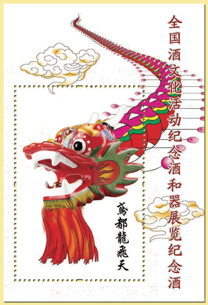 纪念酒(器)展览纪念酒——鸢都龙飞天。 编号:AWSU-005-2018。 酒器由集翠轩.荷叶壹佰艺术工作室创意设计,广东潮州禧祺艺术陶瓷创作团队雕塑。 选用世界风筝之都—潍坊—龙头蜈蚣造型,寓意酒文化活动纪念酒(器)创意设计犹如“鸢都飞龙在天”,此酒器首创了适合酒文化收藏(陈列)馆立体展示的龙头蜈蚣纪念酒。 酒器高10cm,最大宽度9cm,酒器部分长13cm。灌装65度75毫升山东宏源酒业有限公司佳酿。