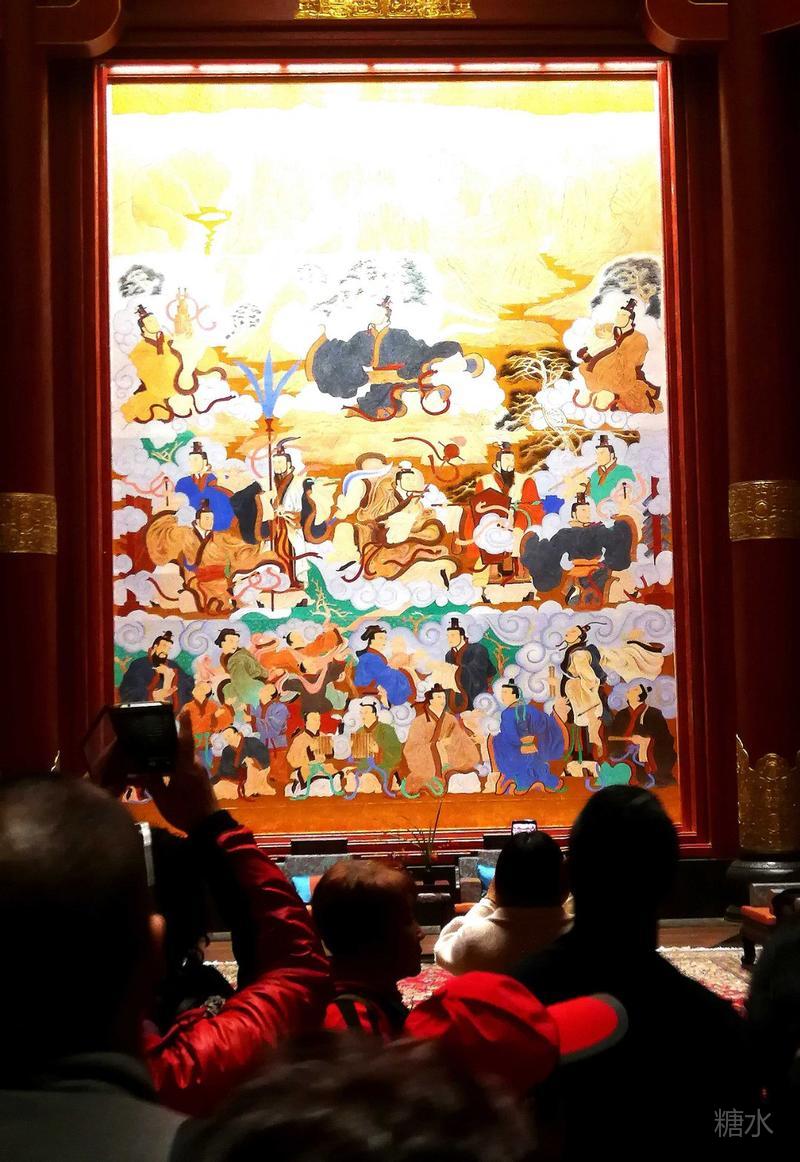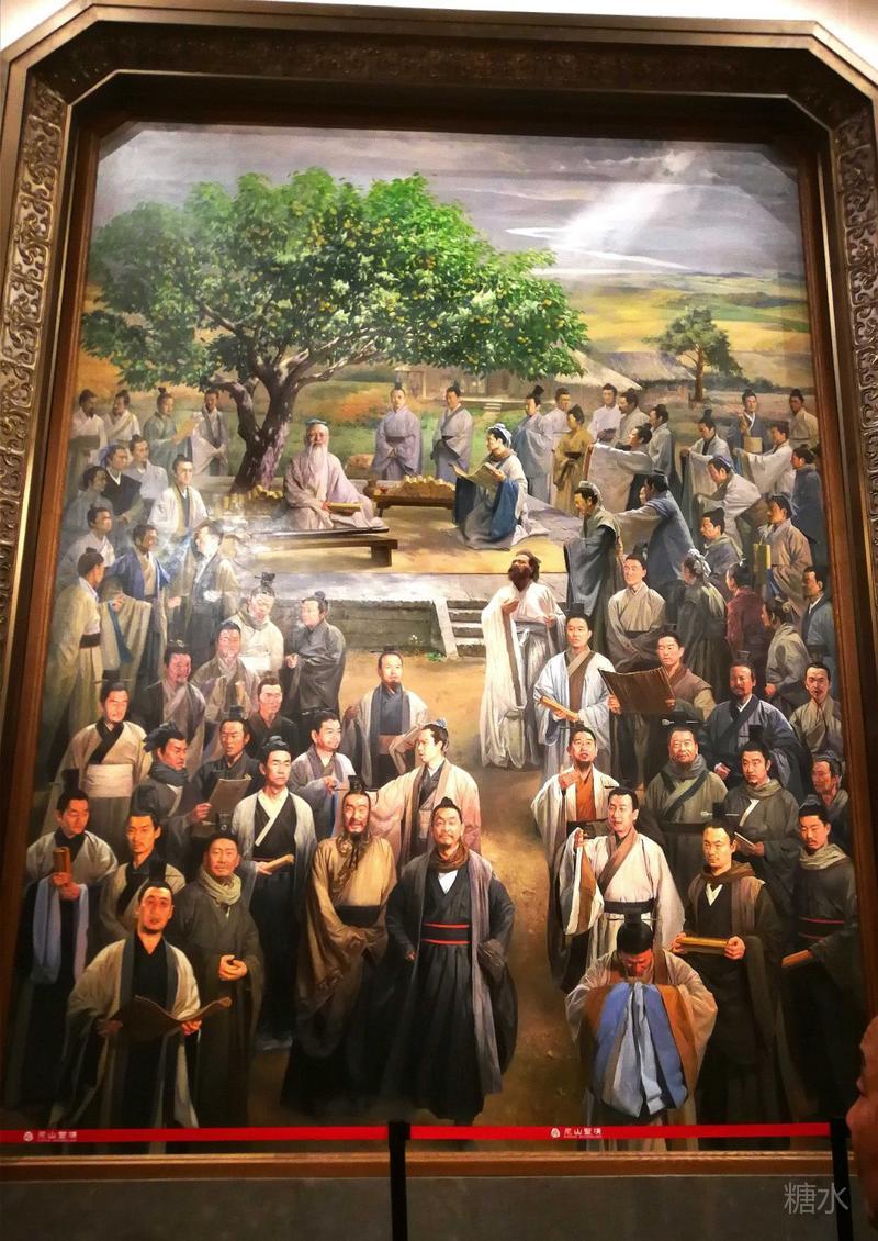 我们进入了大学堂的第二层大厅。啊,大厅西首是著名的七十二弟子,围坐师傅孔子的大幅彩图。