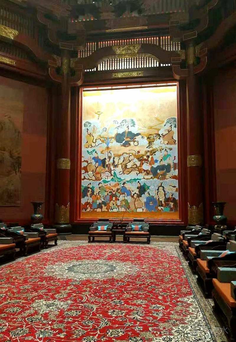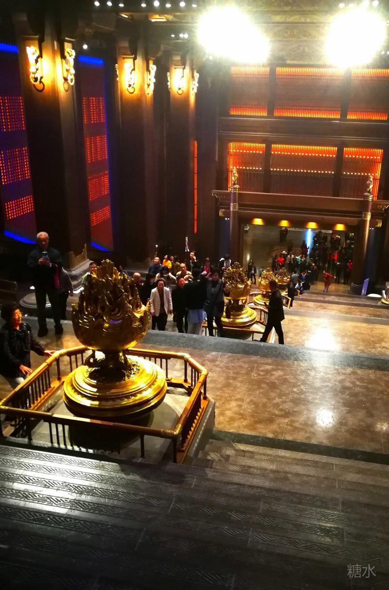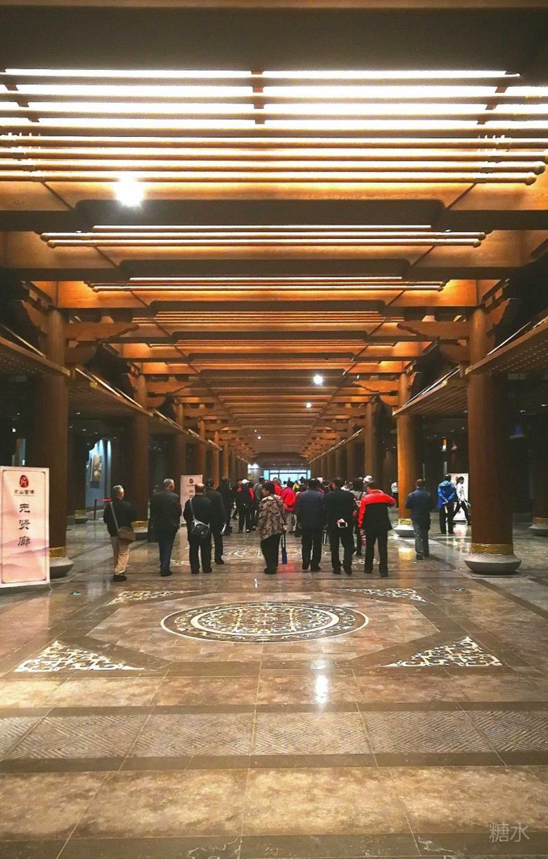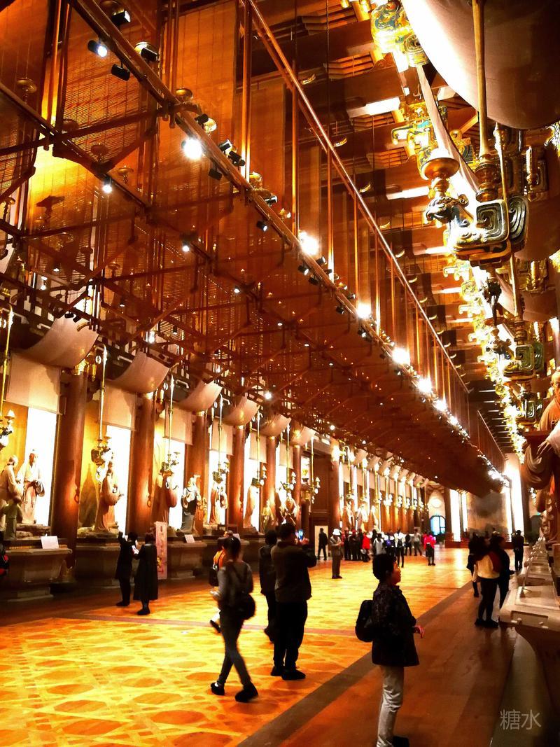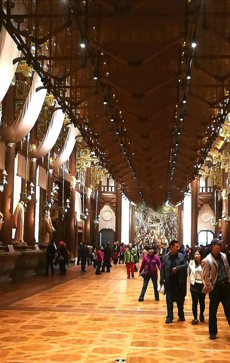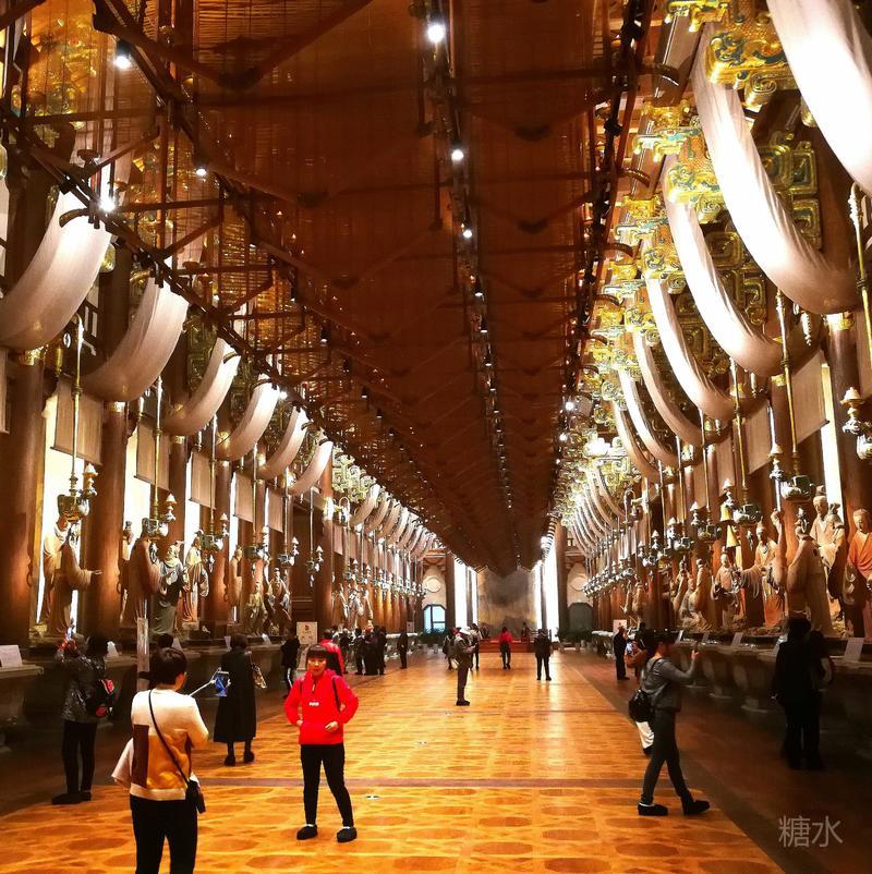 东西长105米,南北宽17.5米,高16米的七十二贤廊,廊内南北两侧建有31组大型壁龛。在灯光的照耀下,尊尊壁龛高大辉煌!这里是大学堂最重要的文化空间之一。