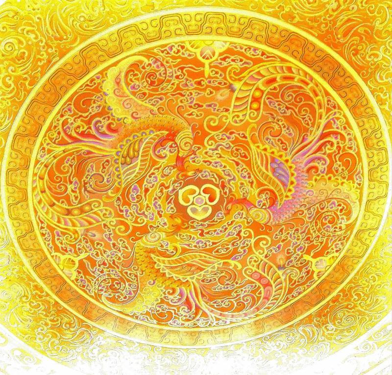 登梯中间,是闪烁着光芒的火焰式造型雕塑。那火焰中间山峰耸立,无数似海浪,又似飞舞的凤凰造型,围绕山峰飞舞。