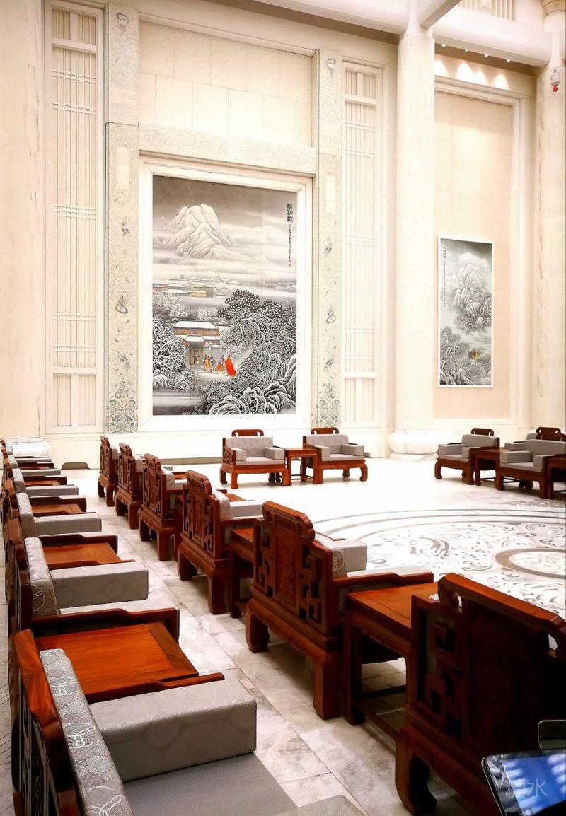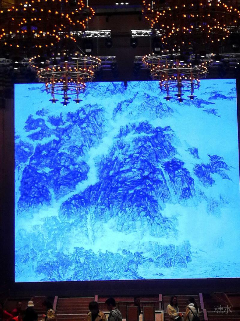 仁厅里,巨大的动态屏幕,不断变化着我国著名的山水画卷。