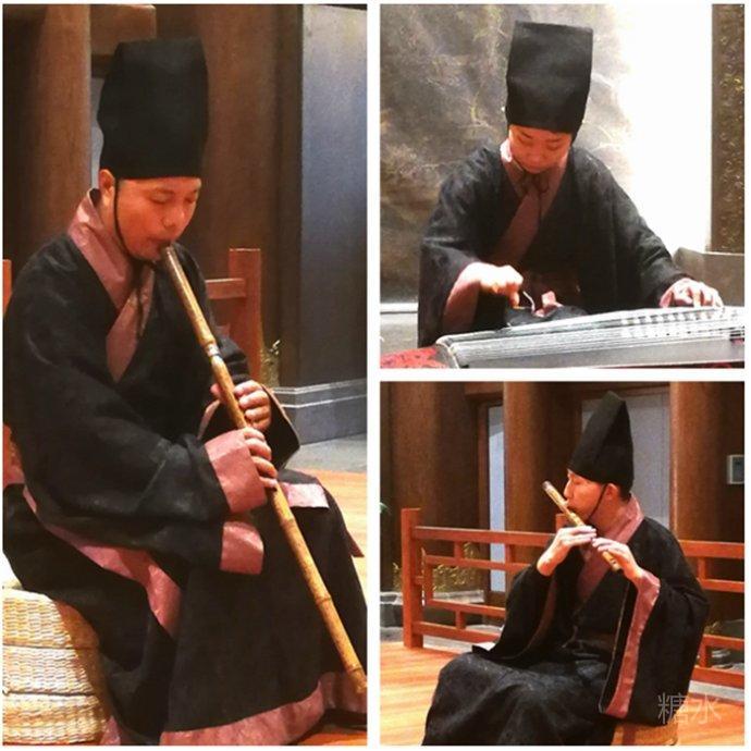 在七十二贤廊的东首,有一组着古装的人物在演奏春秋时期的“韶乐”。