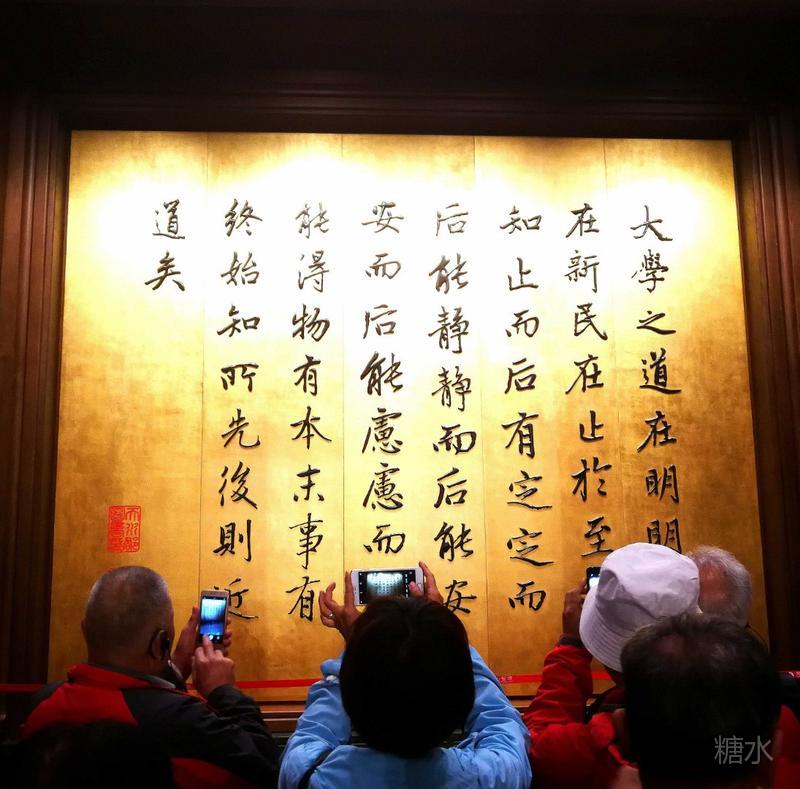 门里即见著名的《大学》开篇:“大学之道,在明明德,在亲民,在止于至善。知止而后有定,定而后能静,静而后能安,安而后能虑,虑而后能得。物有本末,事有终始。知所先后,则近道矣。”明德修身,治家安邦齐天下,这里阐明的是做人道理呀!