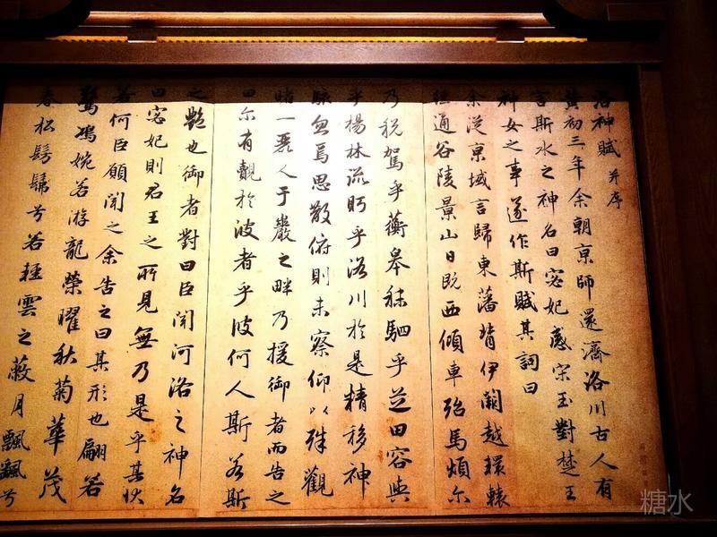 “翩若惊鸿,婉若游龙。荣曜秋菊,华茂春松。髣髴兮若轻云之蔽月,飘飖兮若流风之回雪。远而望之,皎若太阳升朝霞;迫而察之,灼若芙蕖出渌波。 ”大堂里的詩賦《洛神赋》,洋溢着曹植的浪漫主义的情怀。