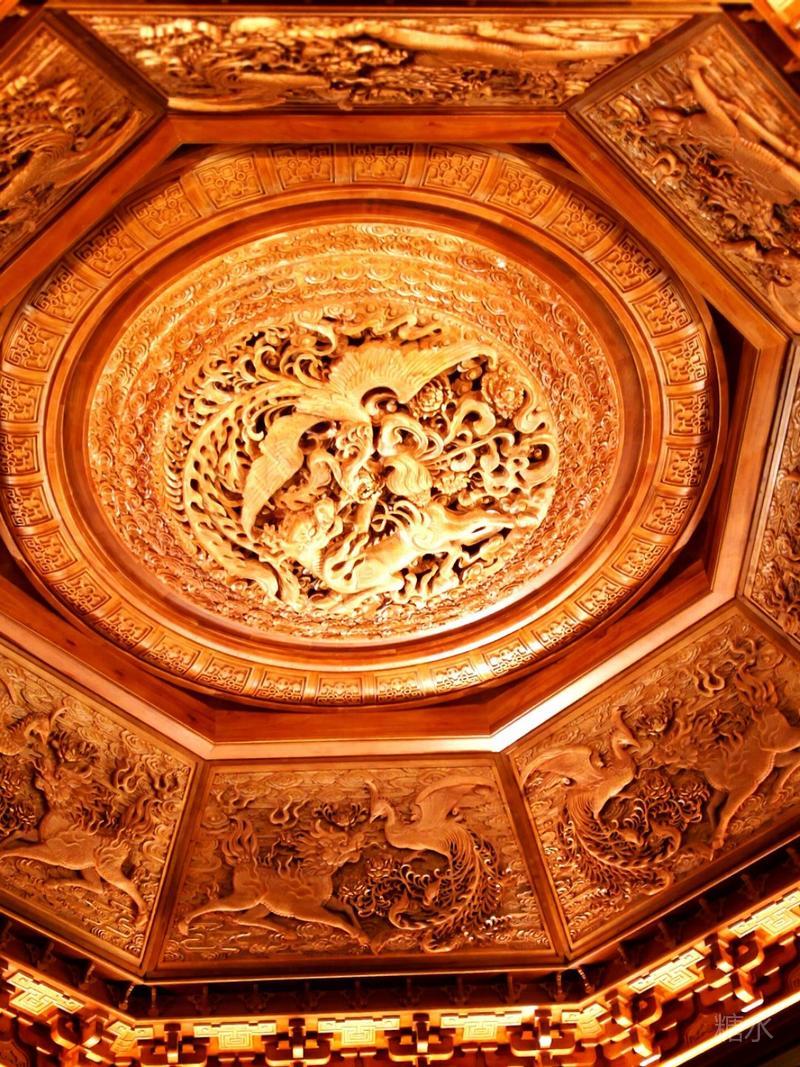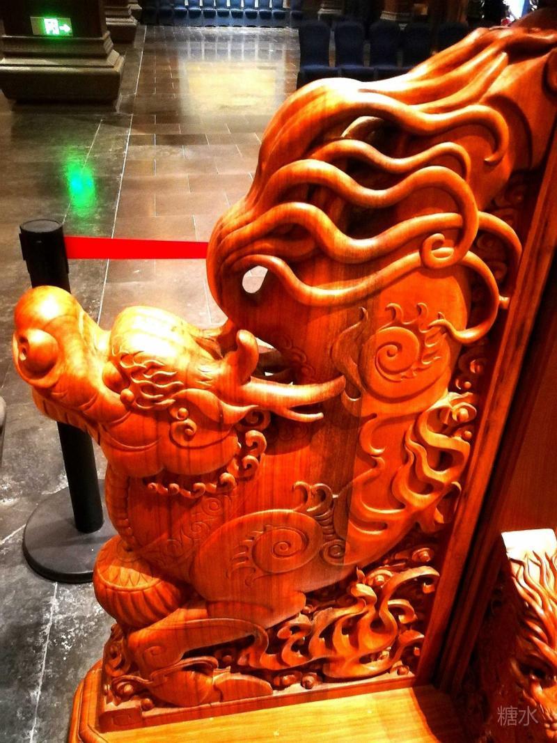 高大的楼梯顶部,雕刻着凤凰、麒麟起舞的雕塑,十分壮观。