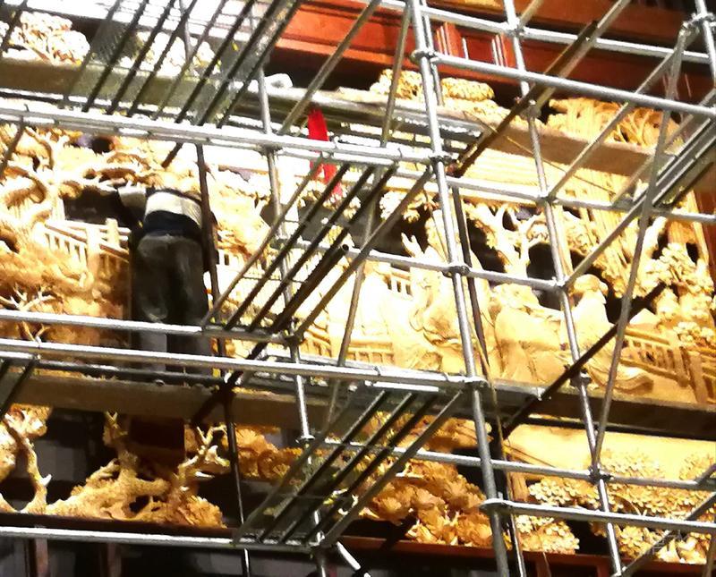 “信”厅的一侧,是一幅还未完工的雕刻壁。看得出如行云流水,规模很大。