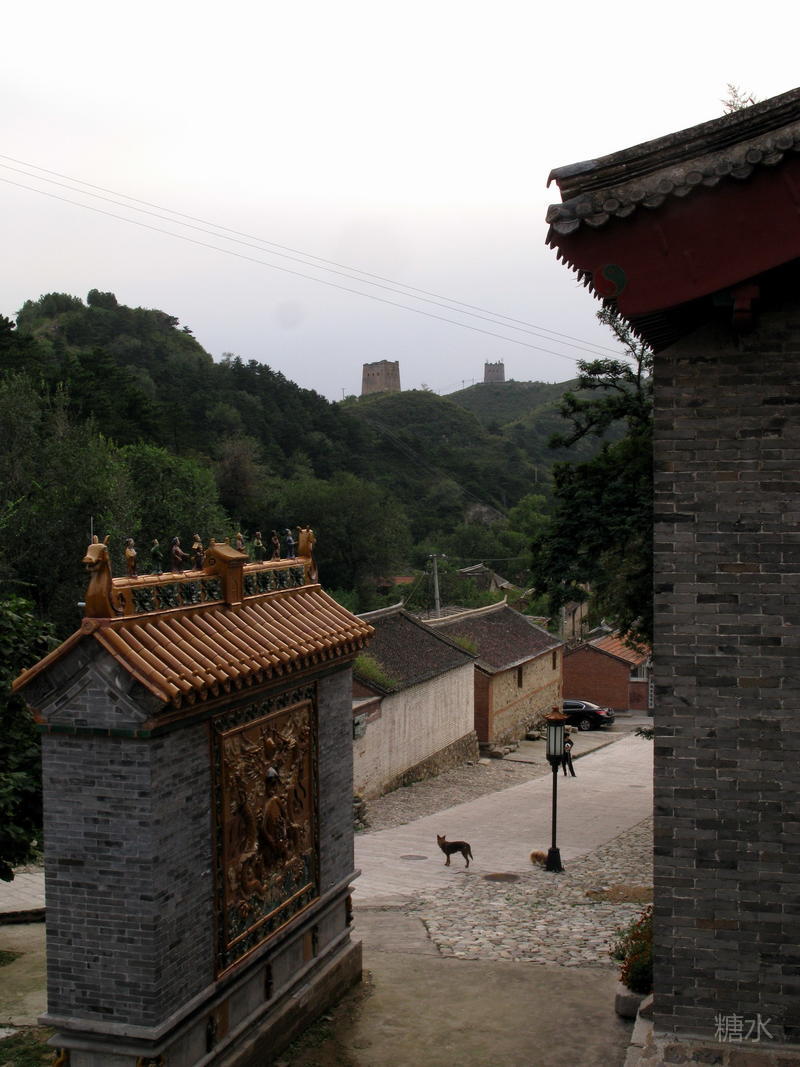 古北口药王庙,琉璃影壁和大花楼 摄影张保田 2009年 照片右侧是古北口戏楼后身,对面是崭新的琉璃影壁,市井儿童唱到:“七郎坟、令公庙、琉璃影壁靠大道,一步三眼井,两步三座庙”即古北口的写照。照片上大花楼右侧是近年新建立的移动通信站,装成长城敌台的样子,并非古代建筑。 上面提到崭新的琉璃影壁与我们长城研究者专家有关,古影壁早就损毁了不见踪影。2008年我们去古北口考察长城时给当地有关部门提供德国女摄影师赫达.莫理循在20世纪30年代拍摄的琉璃影壁照片,影壁才得以尽可能原貌恢复。