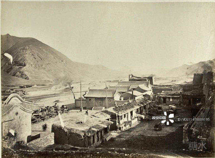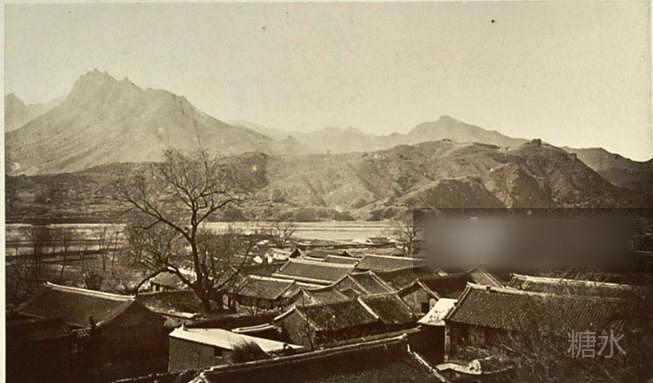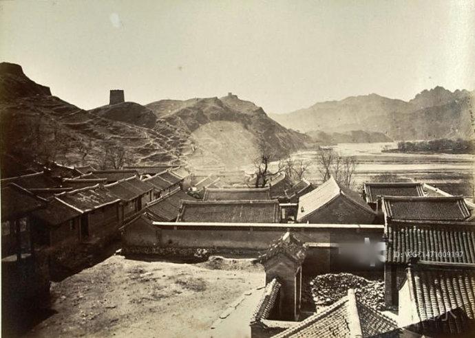 古北口财神庙和大花楼 摄影泰奥菲勒·皮瑞 1875年 古北口有“两步三座庙”的说法,形容其庙宇之多。这幅照片的右下角是财神庙,左侧较高位置则是古北口地标建筑之一--大花楼。