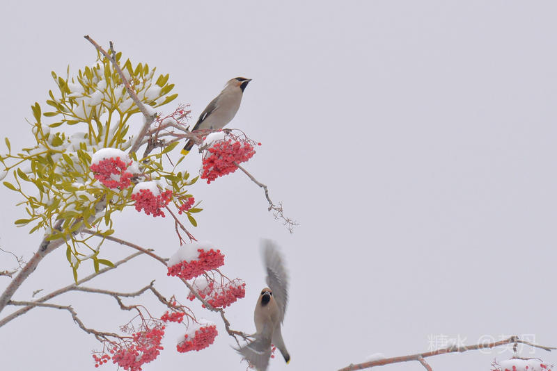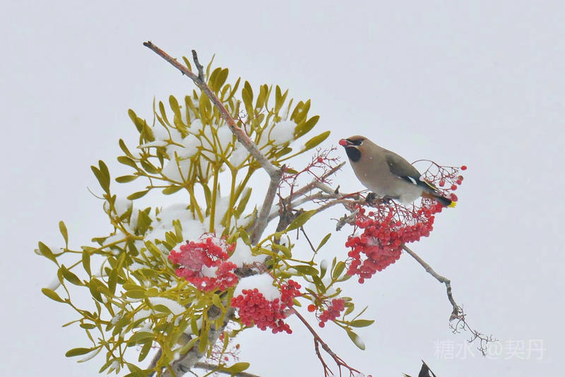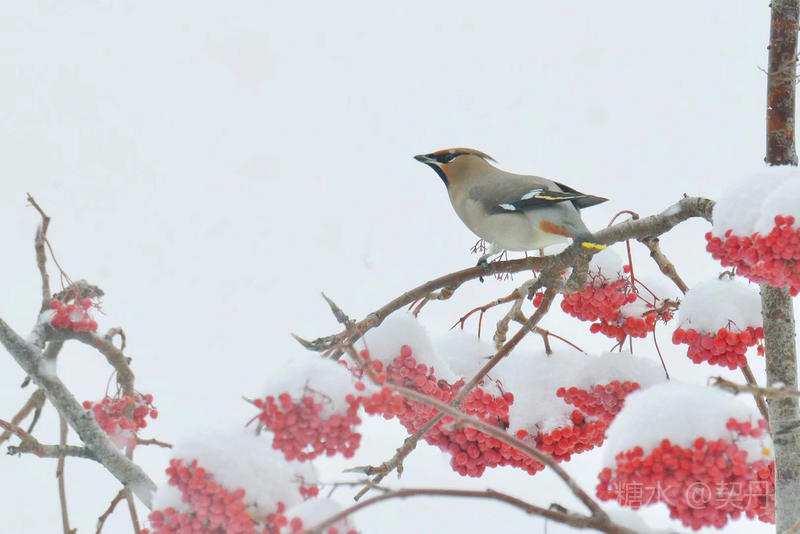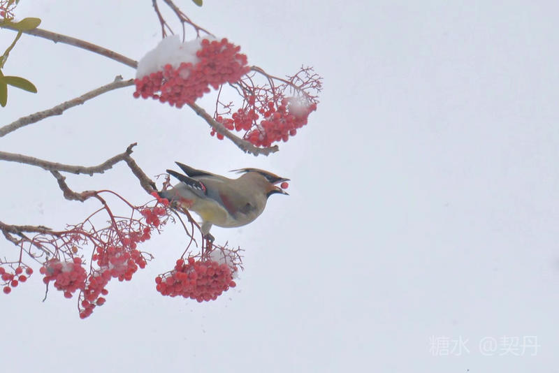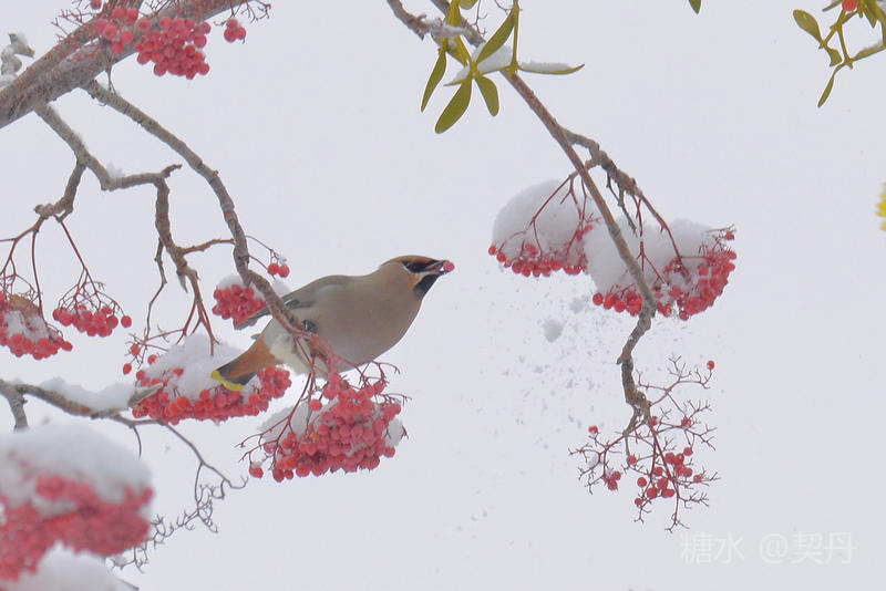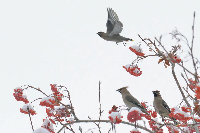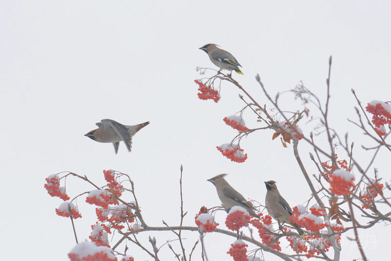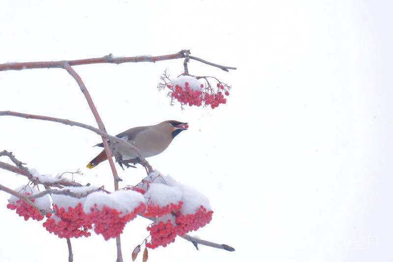 2018-11-22入冬后,太平鸟如期回到小镇。她们要在这里度过漫长的冬季。 雪落花楸,映衬着枝头上的花楸果鲜红如火。太平鸟在红果白雪中欢快的觅食。