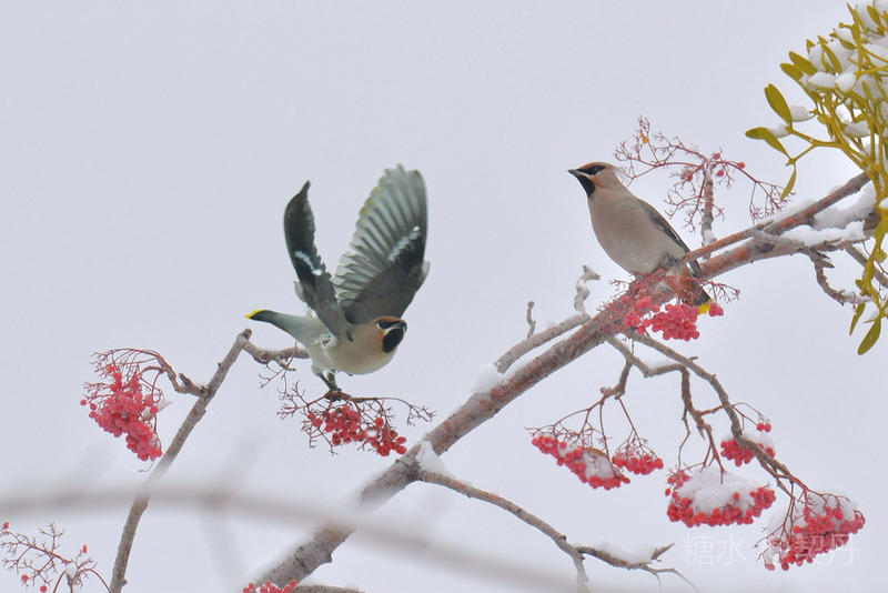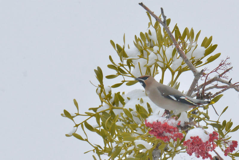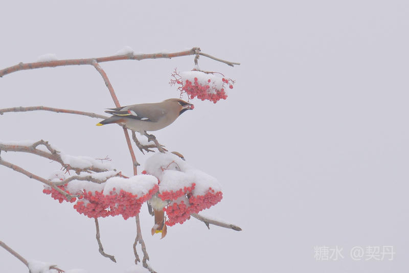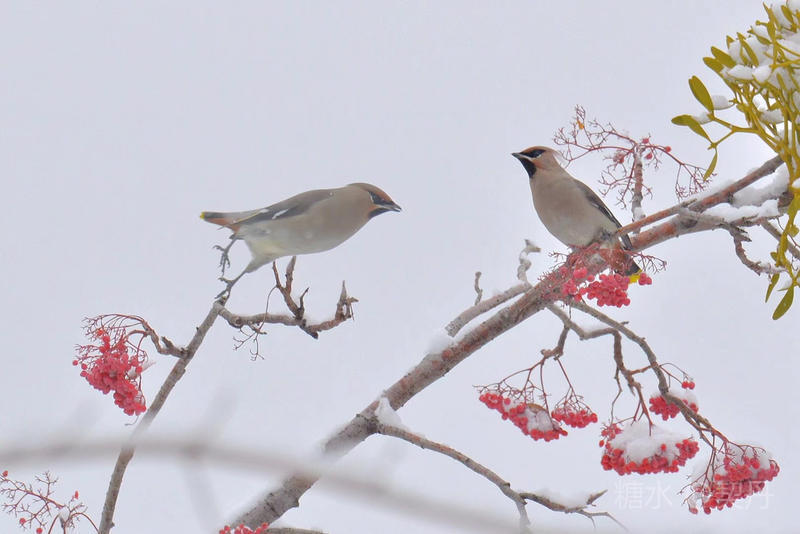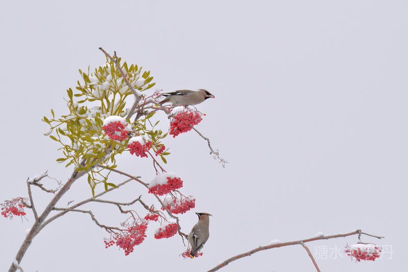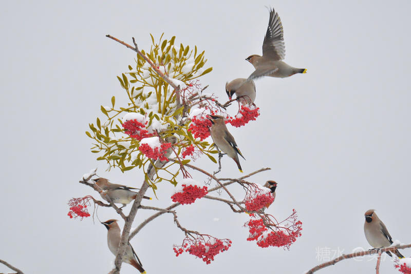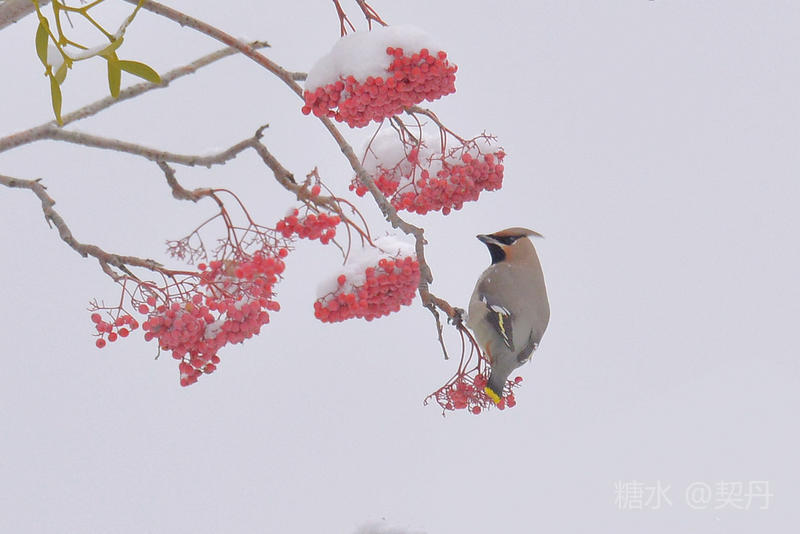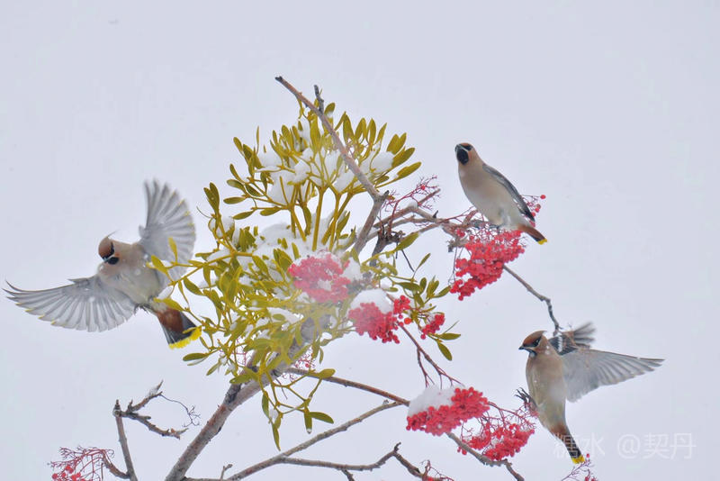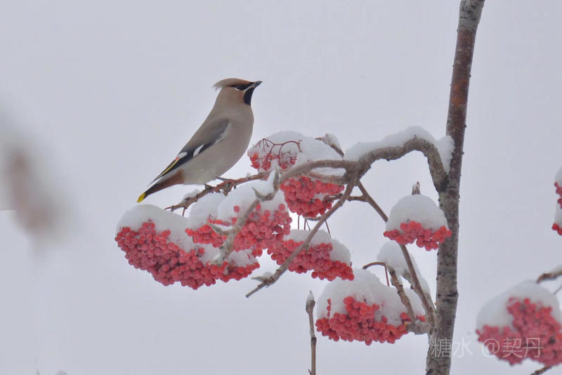 2018-11-22入冬后,太平鸟如期回到小镇。她们要在这里度过漫长的冬季。 雪落花楸,映衬着枝头上的花楸果鲜红如火。太平鸟在红果白雪中欢快的觅食。