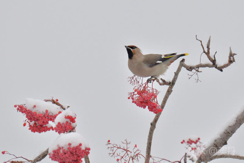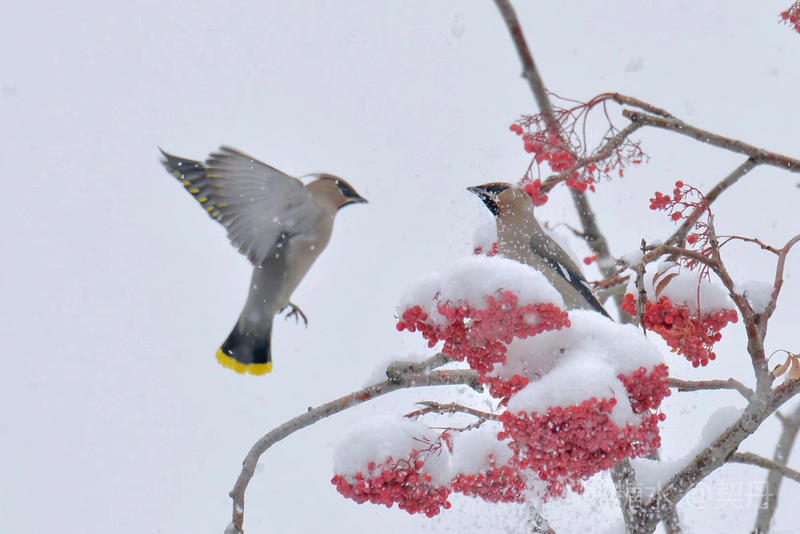 雪落花楸、枝头上舞动的美丽的精灵