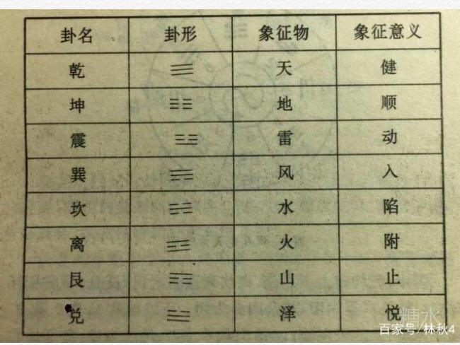 《易经》通俗讲义之五:八卦 八卦 由阳爻、阴爻配合构成,是《易经》中象征宇宙中八种最基本现象的符号。 八卦的卦形、卦名和象征 关于卦字的本义,《周易正义》说:“卦者,挂也。言悬物象以示于人,故谓之卦。”这是以声训义,说明卦和挂的含义的联系。可见,卦是一种古代占筮用的最原始的表义符号。 八卦是一种三爻卦,共有八个,《周礼》称为“经卦”,又称:“小成之卦”,“单卦”等。 八卦都有一定的卦形、卦名、象征物和特定的象征意义。见表格:
