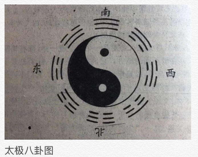 在上面两幅八卦方位图中,中间围住的部分是太极的位置。反映出太极的地位,以及它与八卦的关系。如果将太极的图形加入,就会形成下面这种图式:
