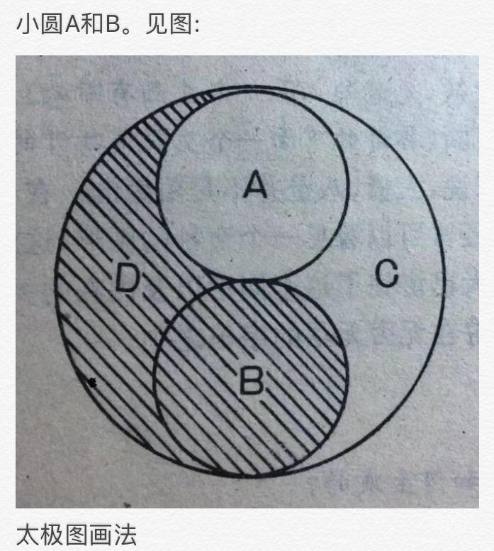 图中白为太阳,黑为太阴,白中之黑为少阴,黑中之白为少阳。八卦按伏羲先天方位次序排列。此图被称为“天地自然之图”,其黑白两部分正好把一个圆等分为两半关于其寓意,清人胡渭曾广采众说,详加解释:“其环中为太极两边黑白回互,白为阳,黑为阴。阴盛于北而阳起薄之:震东北,白一分,黑二分,是为一奇二偶;兑东南,白二分,黑一分,是为二奇一偶;乾正南全白,是为三奇纯阳;离正东,取西之白中黑点,为二奇含一偶,故云对过阴在中也。 阳盛于南,而阴来迎之:巽西南,黑一分,白二分,是为一偶二奇;艮西北,黑二分,白一分,是为二偶一奇;坤正北全黑,是为三偶纯阴;坎正西,取东之黑中白点,为二偶含一奇,故云对过阳在中也。坎、离为日、月,升降于乾坤之间,而无定位,故东西交易,与六卦异也。”(《易图明辨》) 太极图的画法 太极图制作精巧,而其方法却并不复杂,兹介绍如下:第一步先画一个大圆,并画出一条直径;第二步以大圆半径的二分之一为半径,在大圆半径的二分之一处上下画两个相切的小圆A和B。见图: