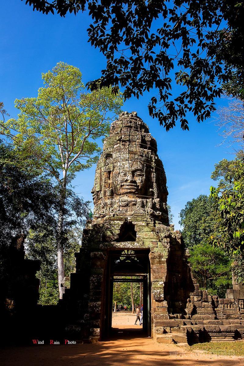 塔布隆寺的入口处是一座带有围墙的城门,在城门上方高耸着一尊四面佛像,走进城门后则是一条长长的林荫小道,让人彷佛走进了一片原始森林,环顾林中四周,看不到任何建筑物。直至到了密林深处,才能发现这座彷佛是从树根丛林里突然蹦出来的神庙。