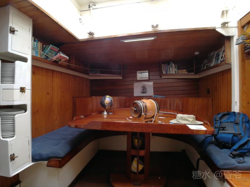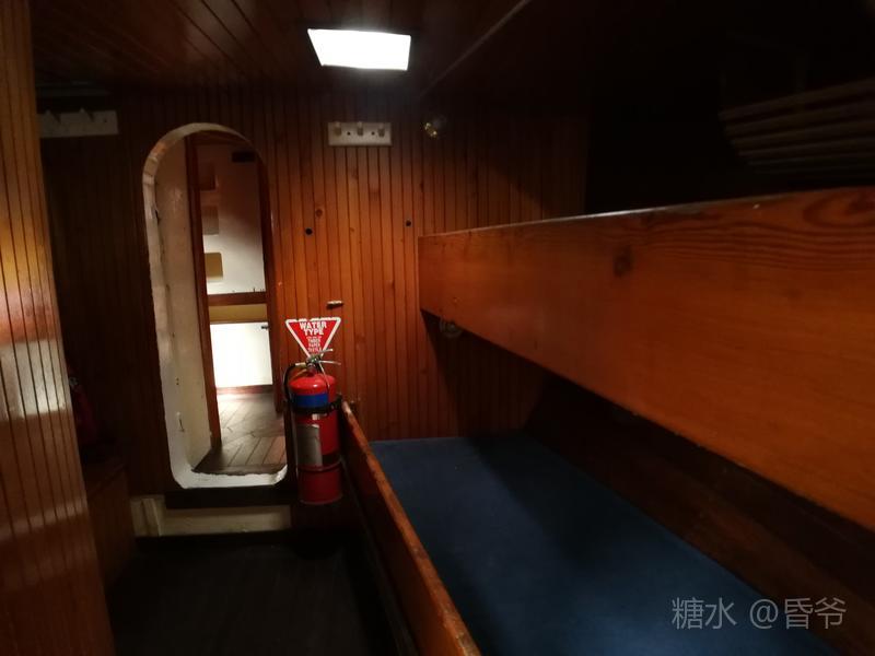 甲班下面的船舱有两个出入口,一个在船头,另外一个在船尾。里面有一个小客厅,船员休息睡觉的铺位,分上下铺,洗手间。舱内空间很狭窄,行走时要特别小心。